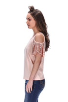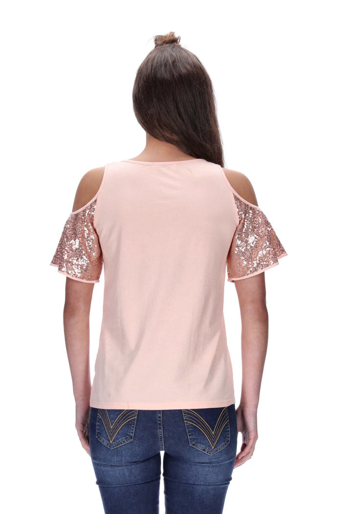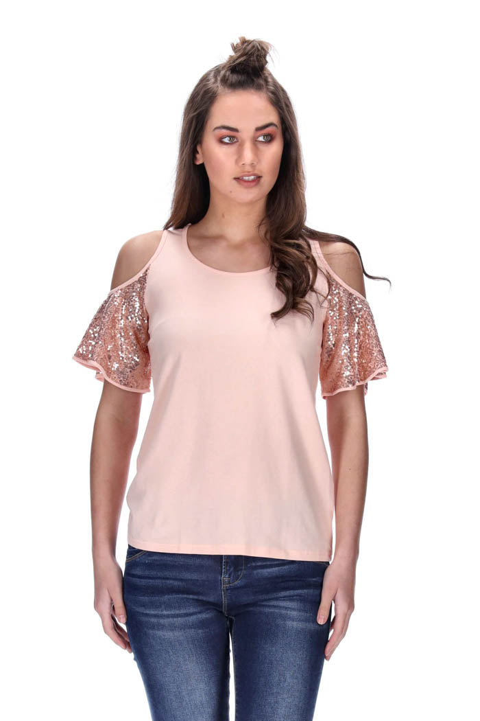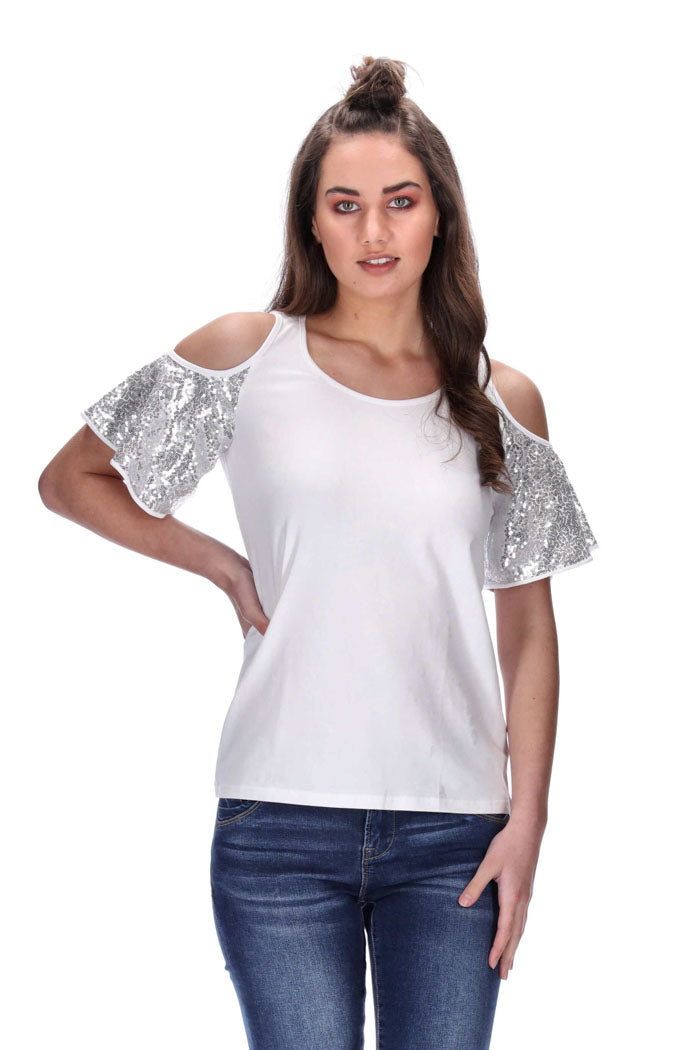 T-Shirt Features: A revamp on the skyler with contrasting sequin sleeves, shoulder cutouts and a straight hemline
