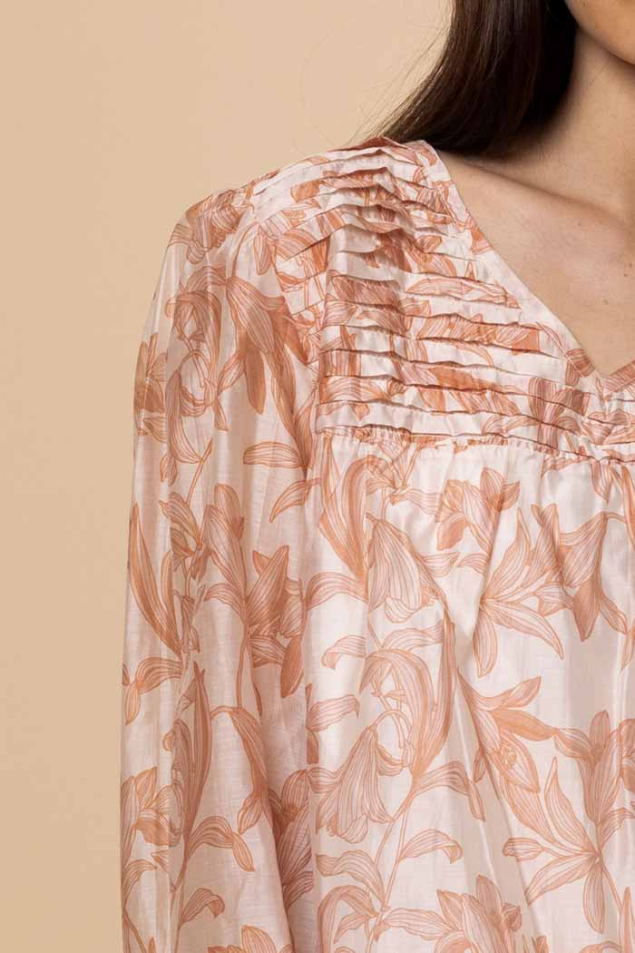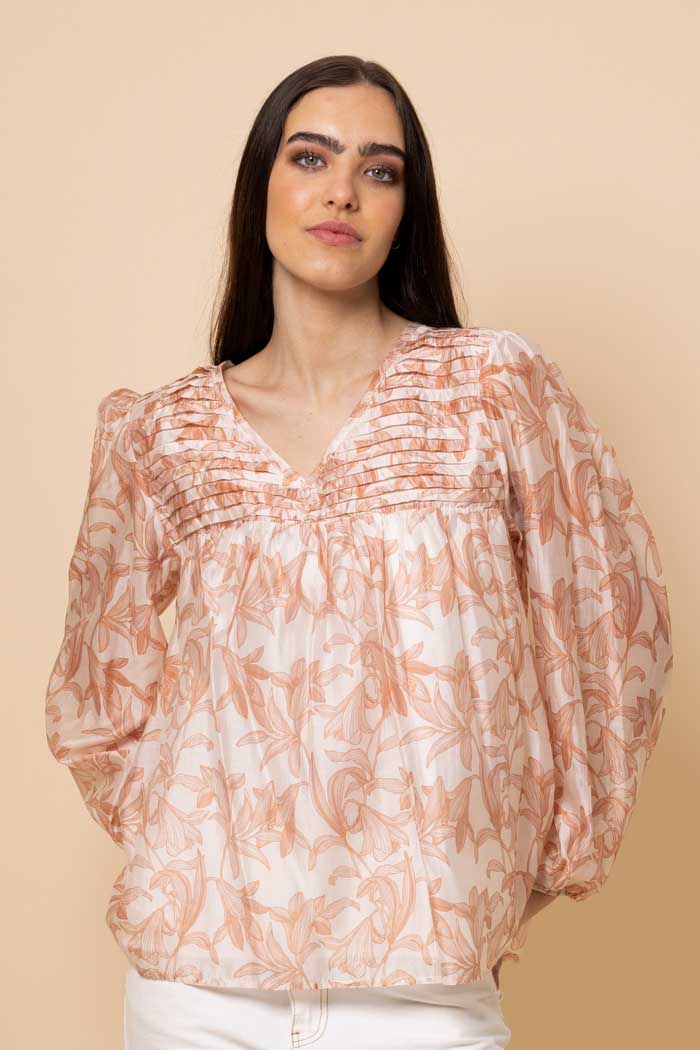 A soft rust floral blouse with pleated detailing.