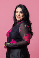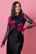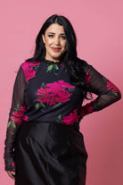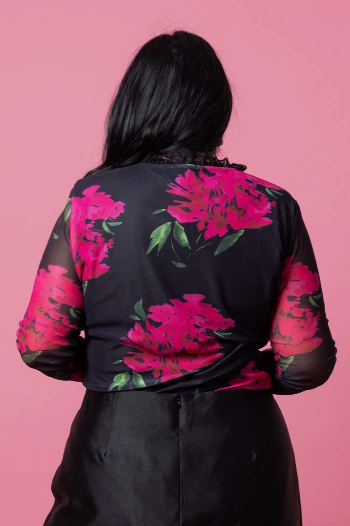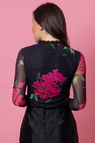 A soft mesh like black and pink floral top with small frill neckline detail.