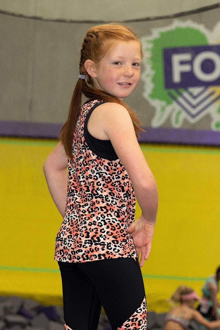 A ribbed peach leopard print singlet top with black binding around the neckline and armholes.