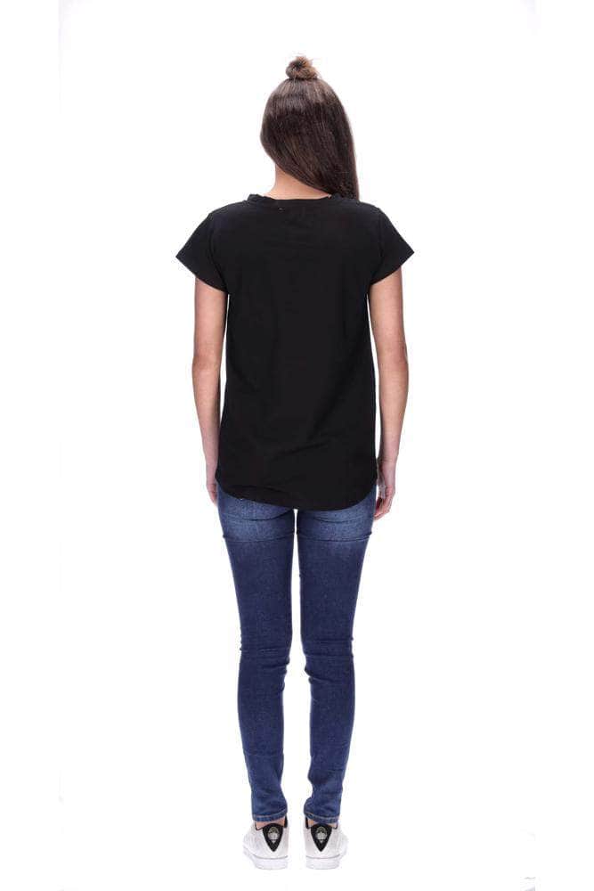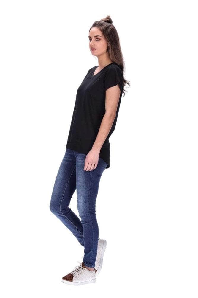 Features: Flattering V neck with self fabric neck binding and a dipped back hemline