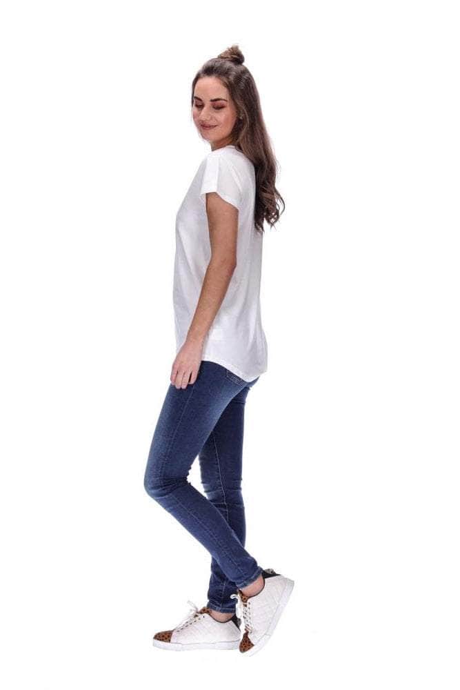 Features: Flattering V neck with self fabric neck binding and a dipped back hemline