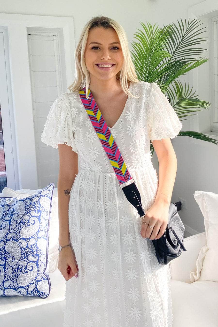 A pink and yellow adjustable woven bag strap with faux leather, and gold hardware clasps