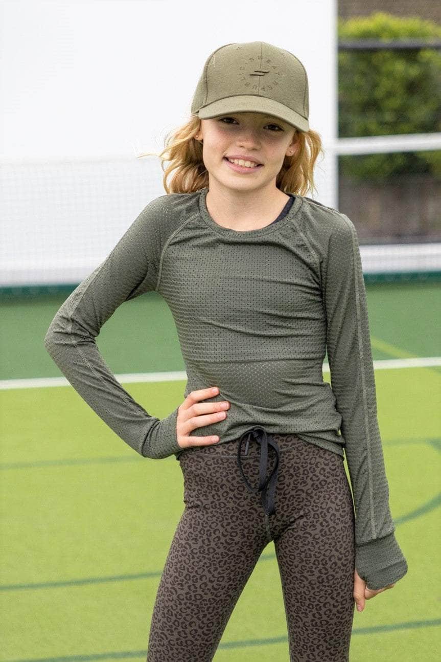 A breathable khaki stretchy mesh long-sleeve top, with thumb holes.