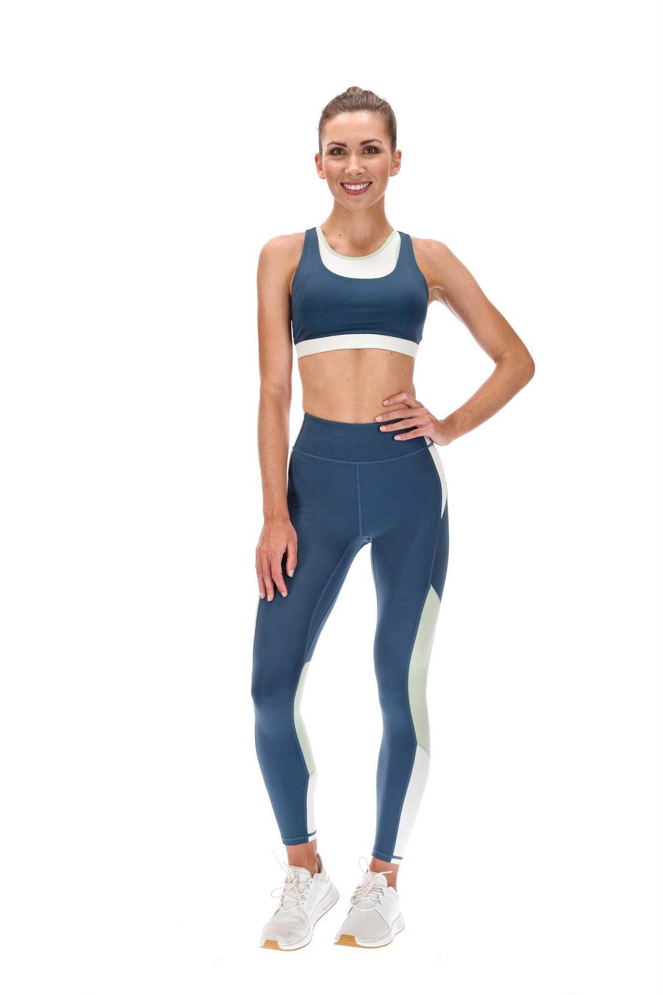 A lovely full length dark teak base legging with white & mint panels at the waist down the outer leg. SWEAT logo on back leg, and large phone pocket in back waistband