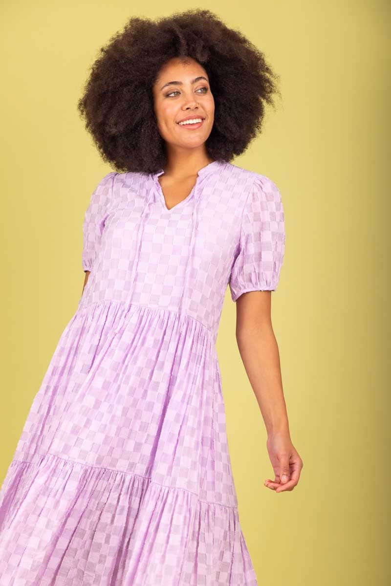 A lilac check print tiered midi dress.