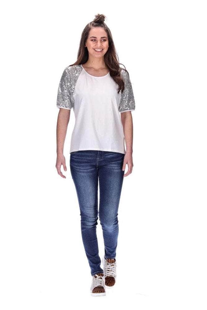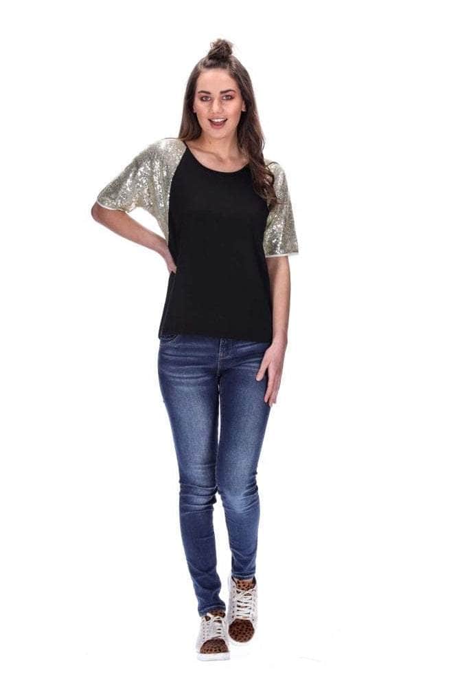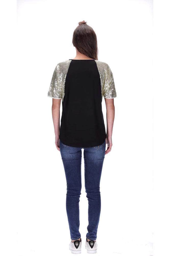 Features: Raglan seam, contrast sequin sleeves, curved hem, dipped back