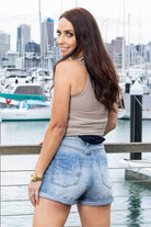 Distressed non stretch blue denim mid rise shorts with rolled cuffs and rips with gold sequins underneath