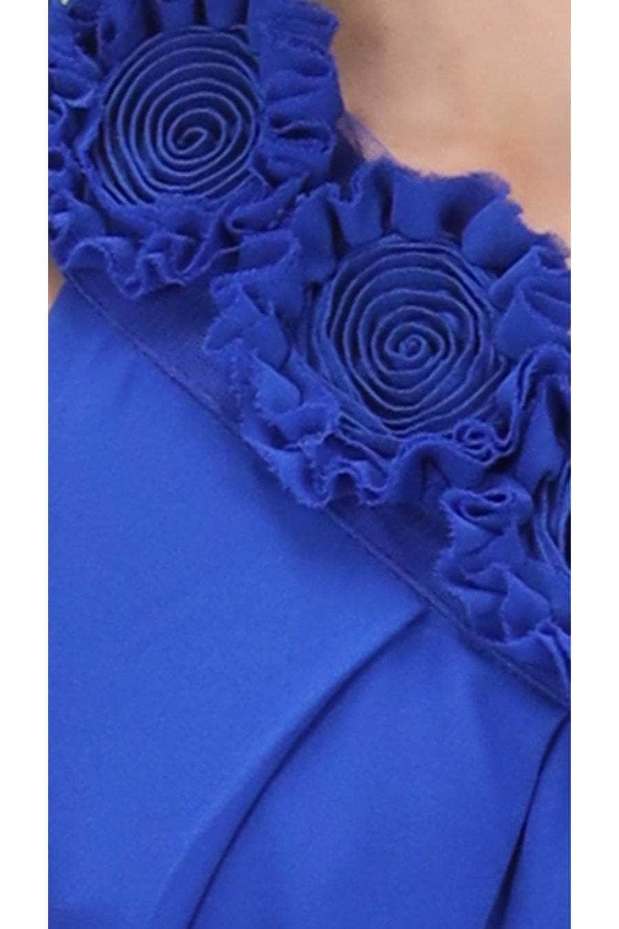 - Off-shoulder neckline with fabric rosette flowers