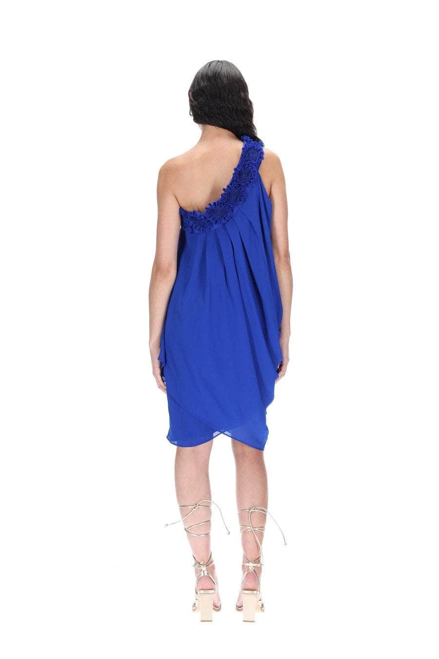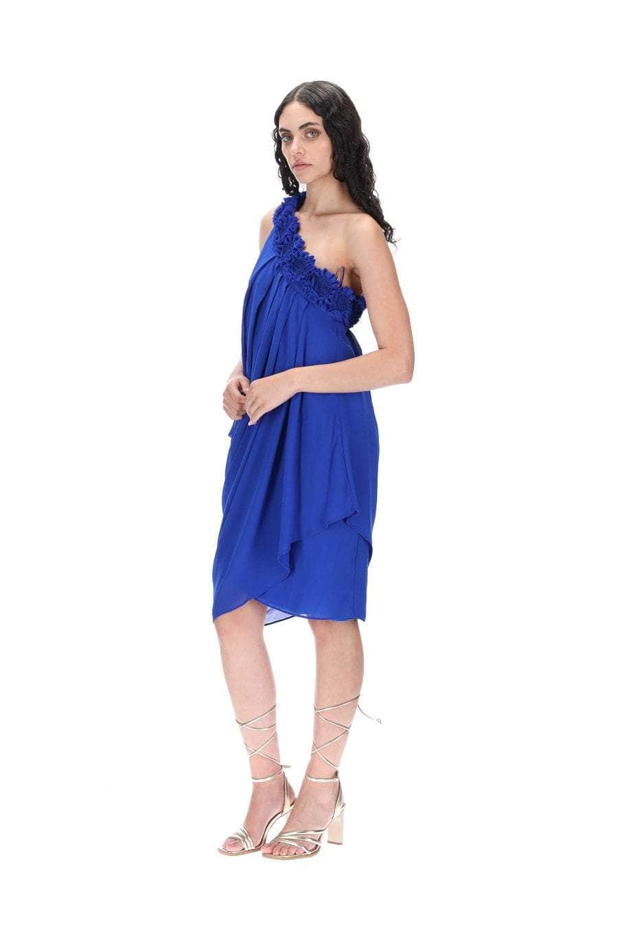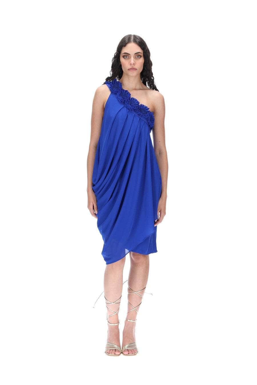 A blue drapey midi dress with an off-shoulder rosette neckline.