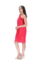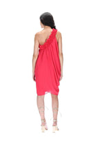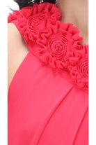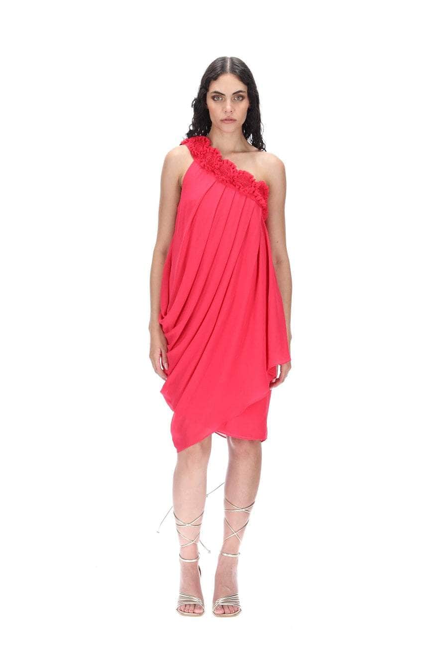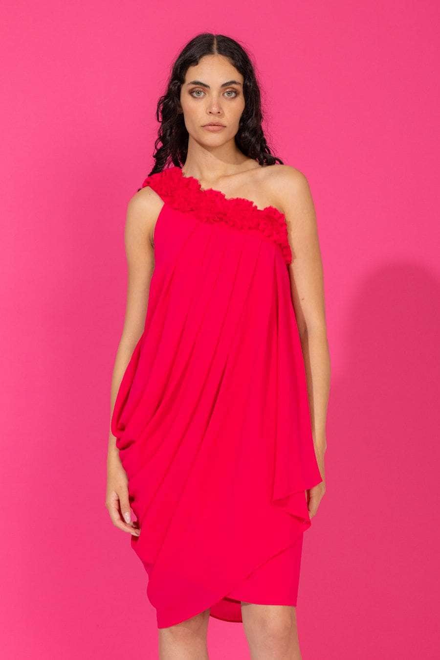 A hot pink drapey midi dress with an off-shoulder rosette neckline.
