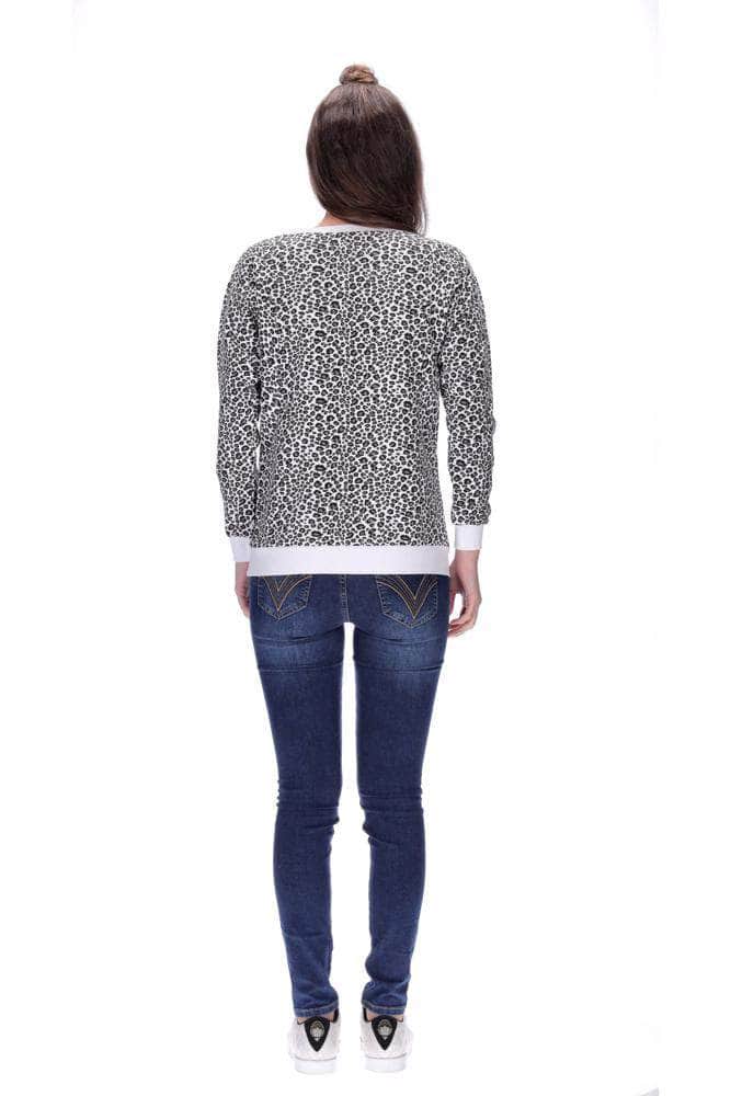 Features: French terry sweater in a stunning leopard print with batwing sleeves and chunky ribbed neckline, cuff and hem
