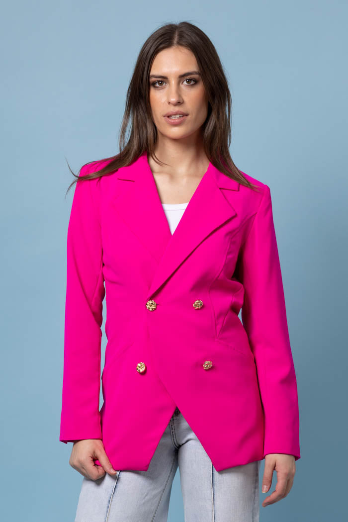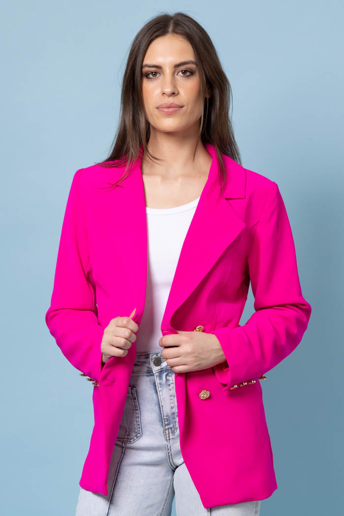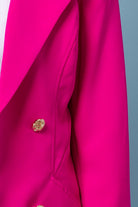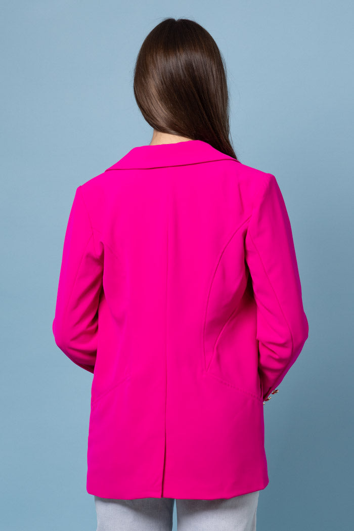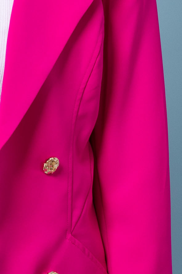 Beautiful hot pink suit jacket with lovely panel, stitch detailing through the body, fancy gold metal buttons at front body and sleeve hems. Jacket also has pockets at front extending from panel lines and has soft shoulder pads for structure.