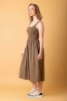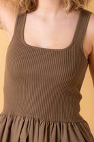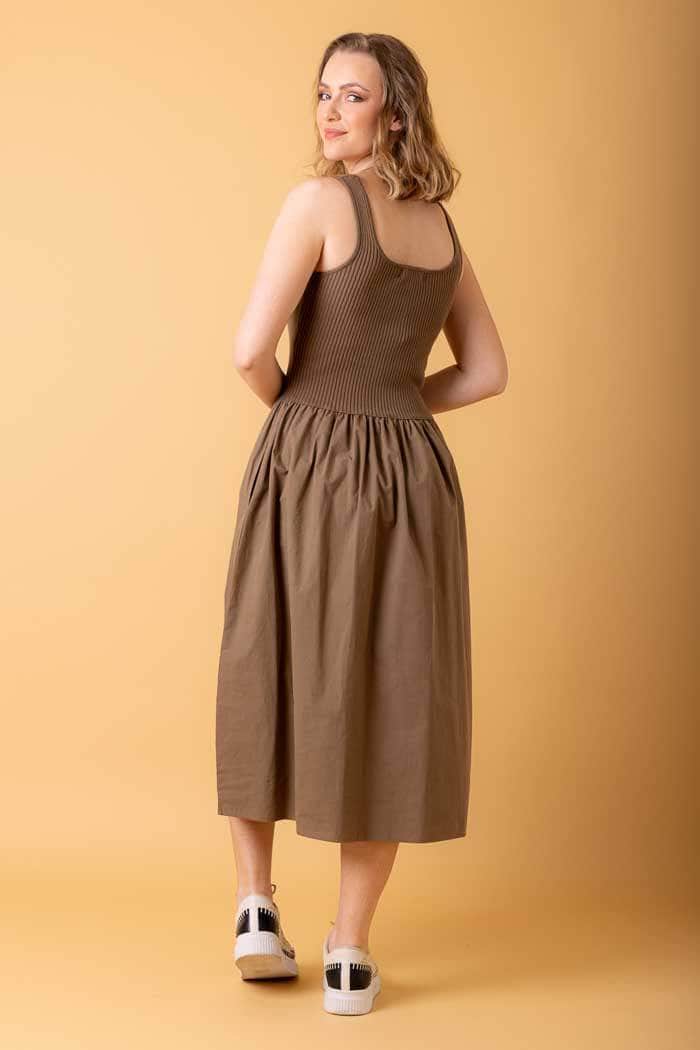 A khaki brown drop waist midi dress with a stretchy ribbed bodice.
