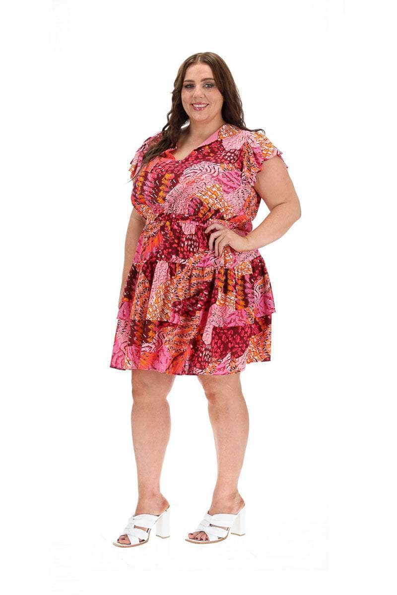 A dark pink abstract print tiered mini dress.