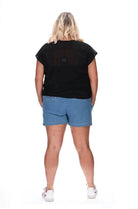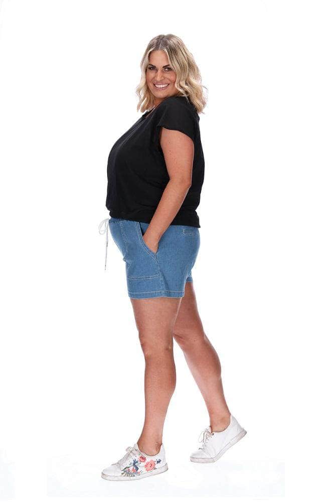 Cute shorter length shorts styled in stretch denim and topstitched in white, featuring elasticated drawstring waist and patch pockets.