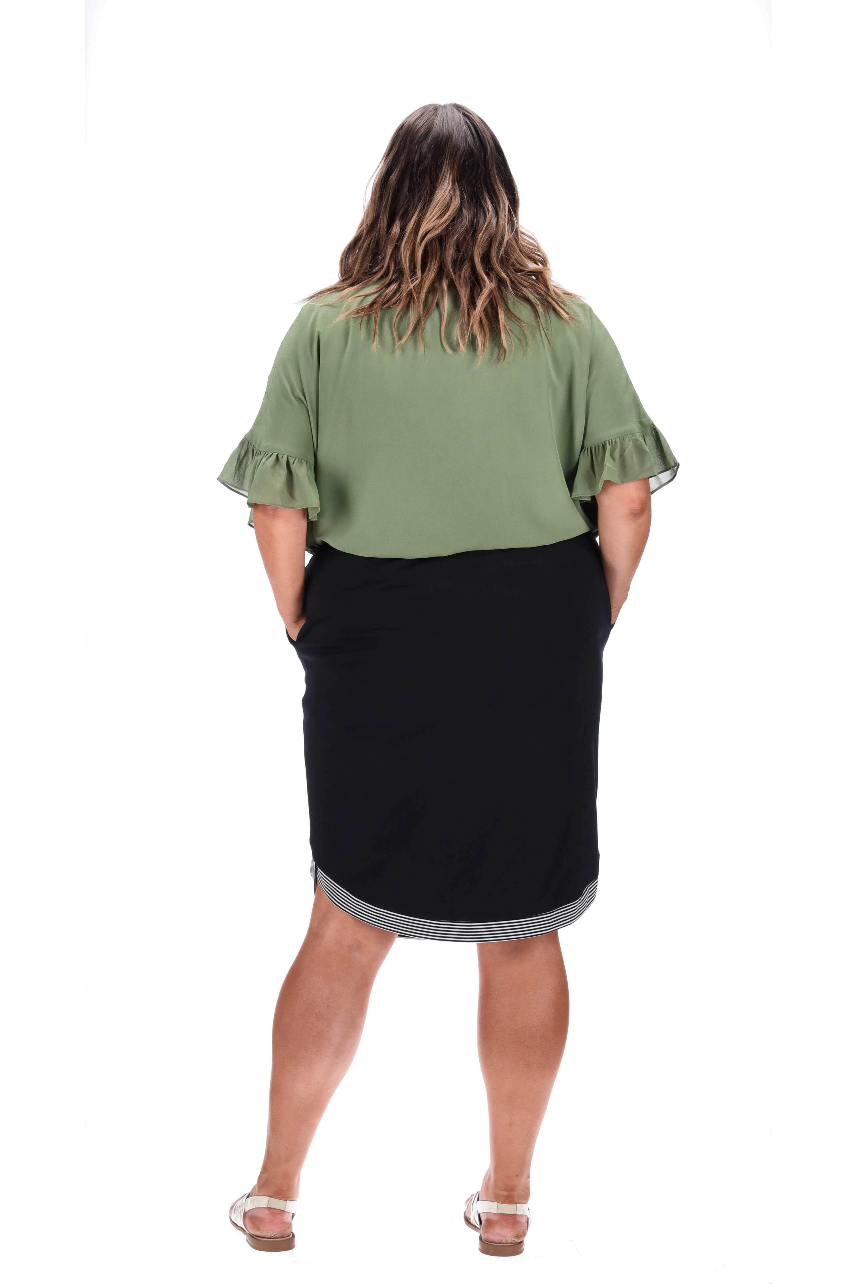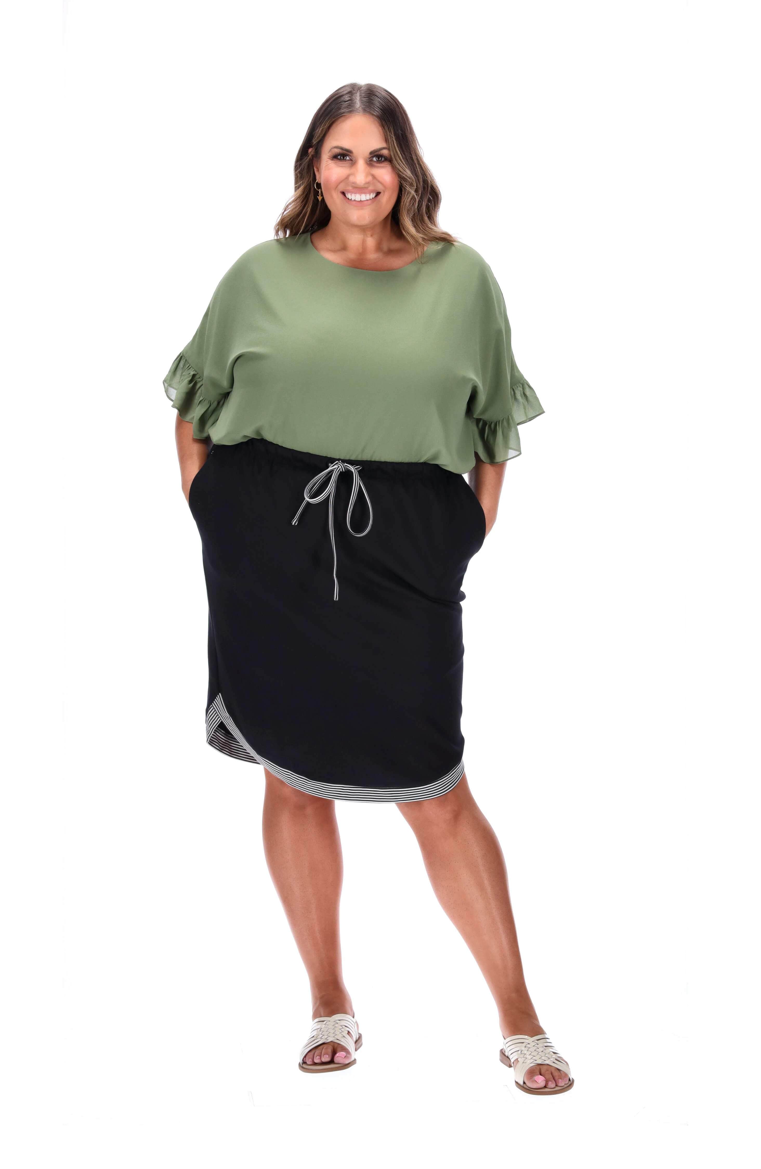 Such a great shape knee length skirt featuring elasticated drawstring waist, side pockets, and shaped hem with contrast stripe detail.