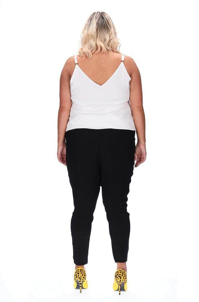 Super cool drop crutch pants styled in a crepe finish soft woven fabric with knit leg panels. Featuring elasticated drawstring waist, side pockets and tapered legline.