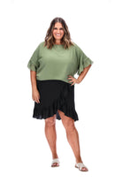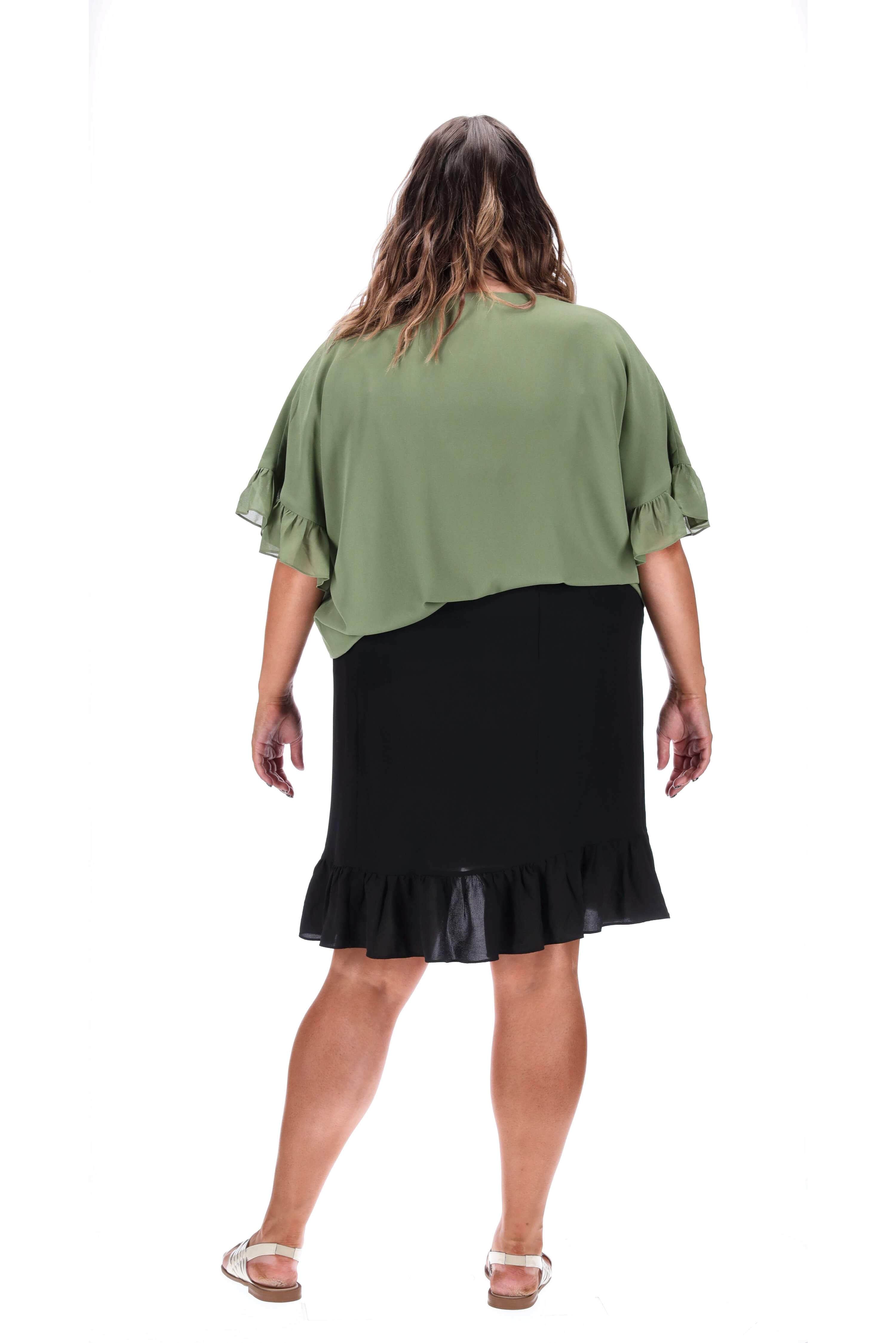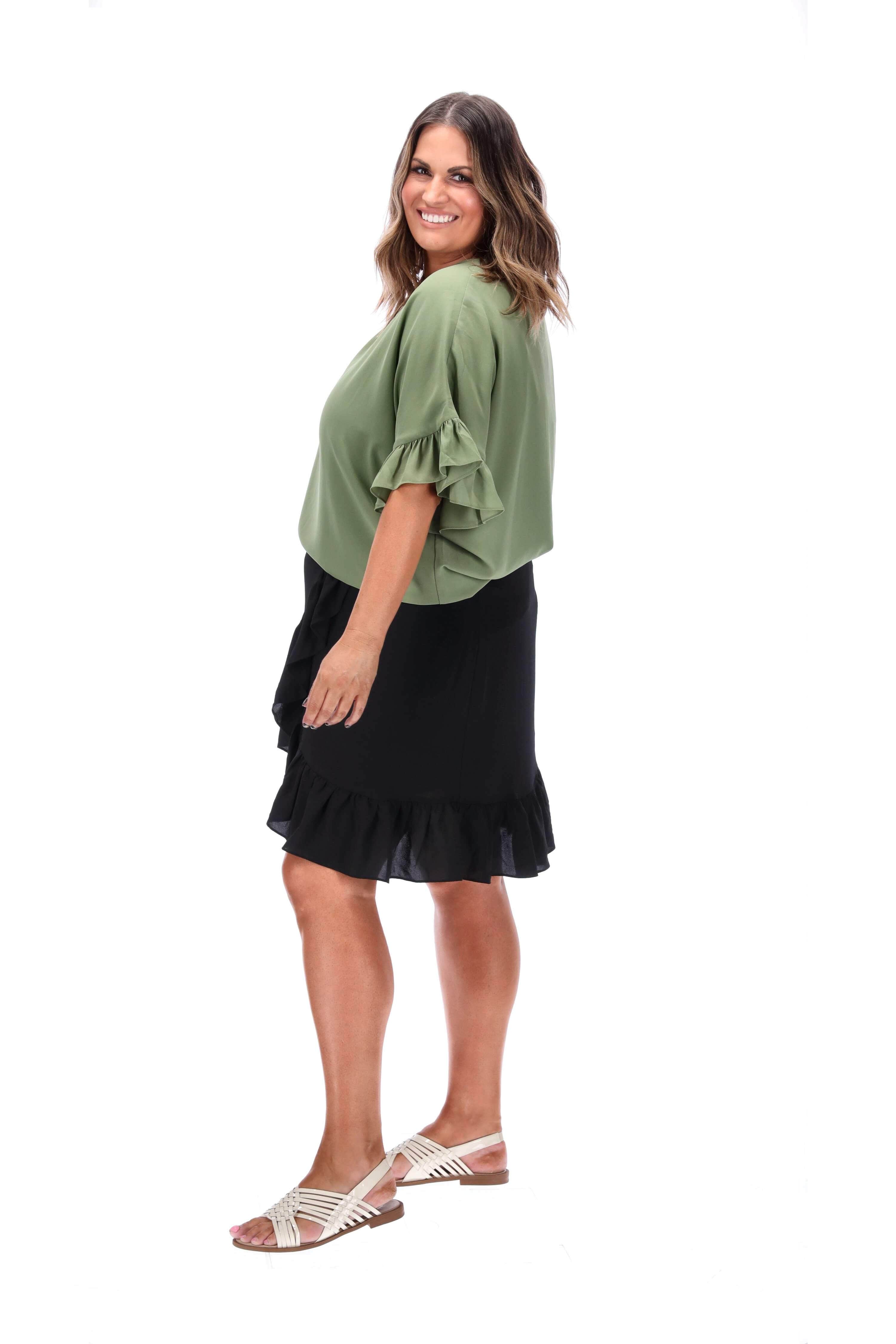 A gorgeous knee length skirt with wrap front and ruffle detail around the hem. Fully lined with a back zip and enclosed elastic in back waistband.