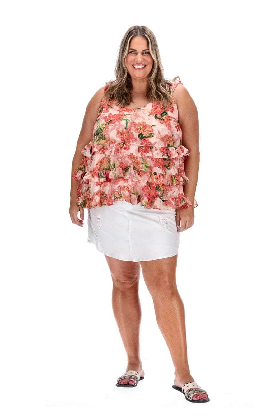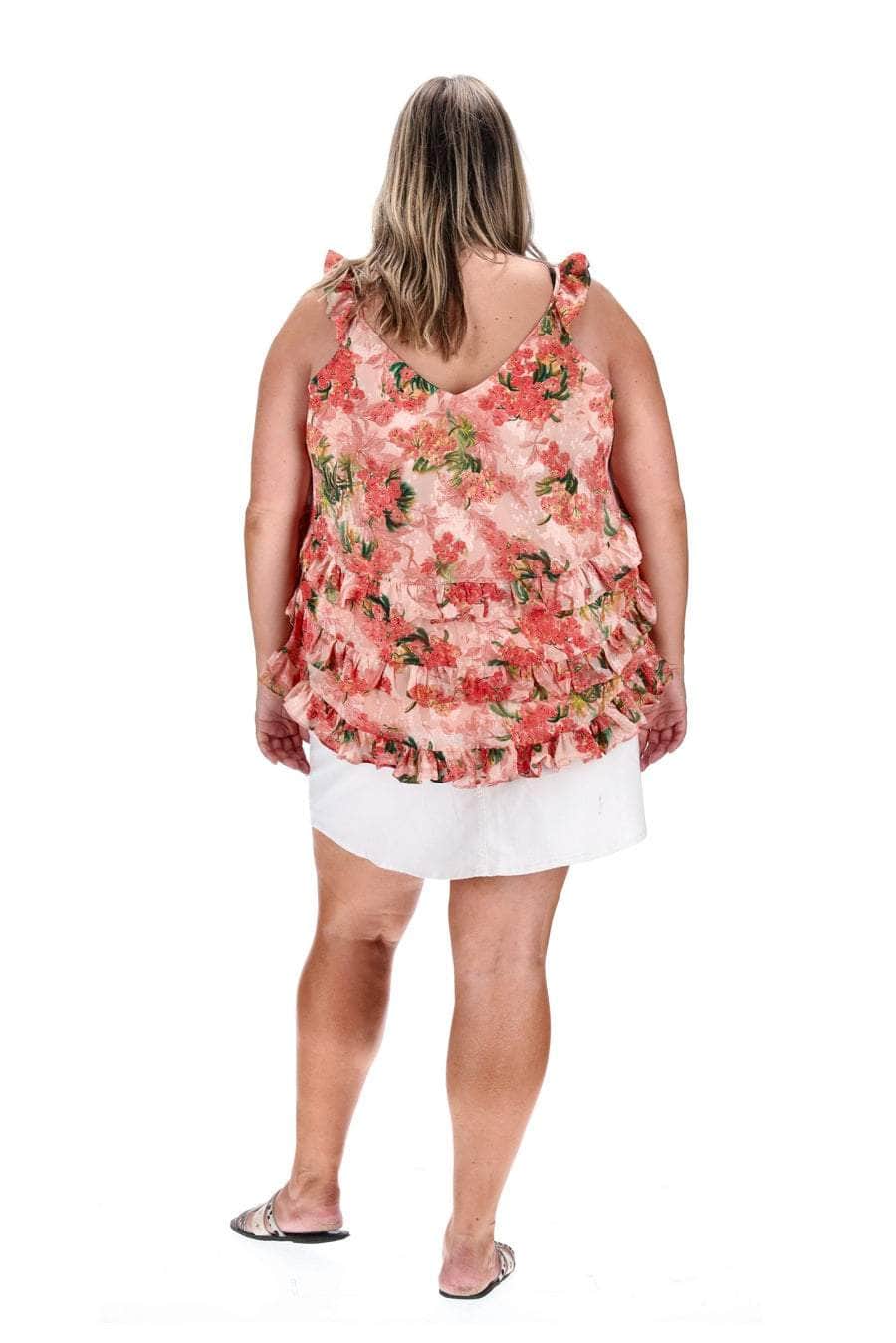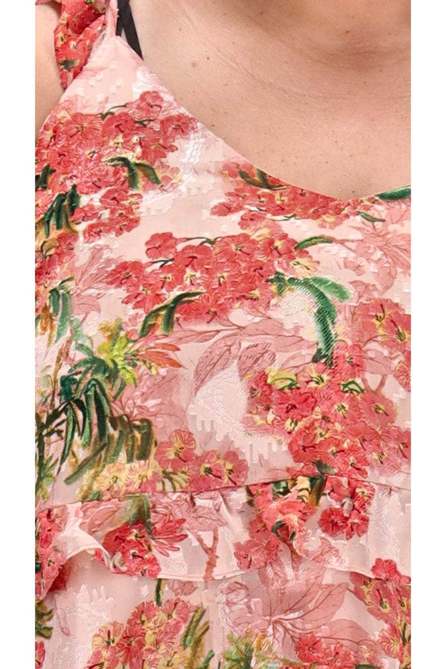 A frilly blush pink floral print top.