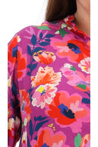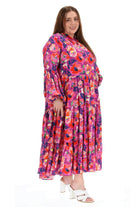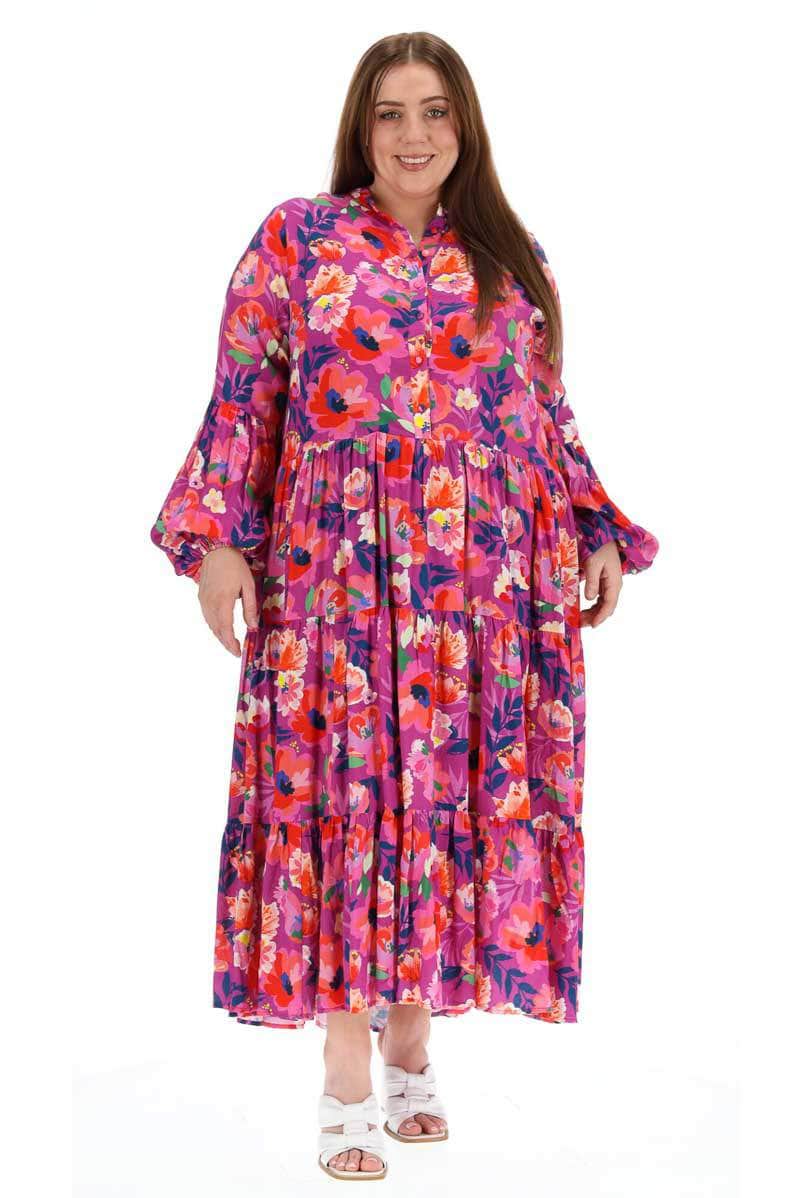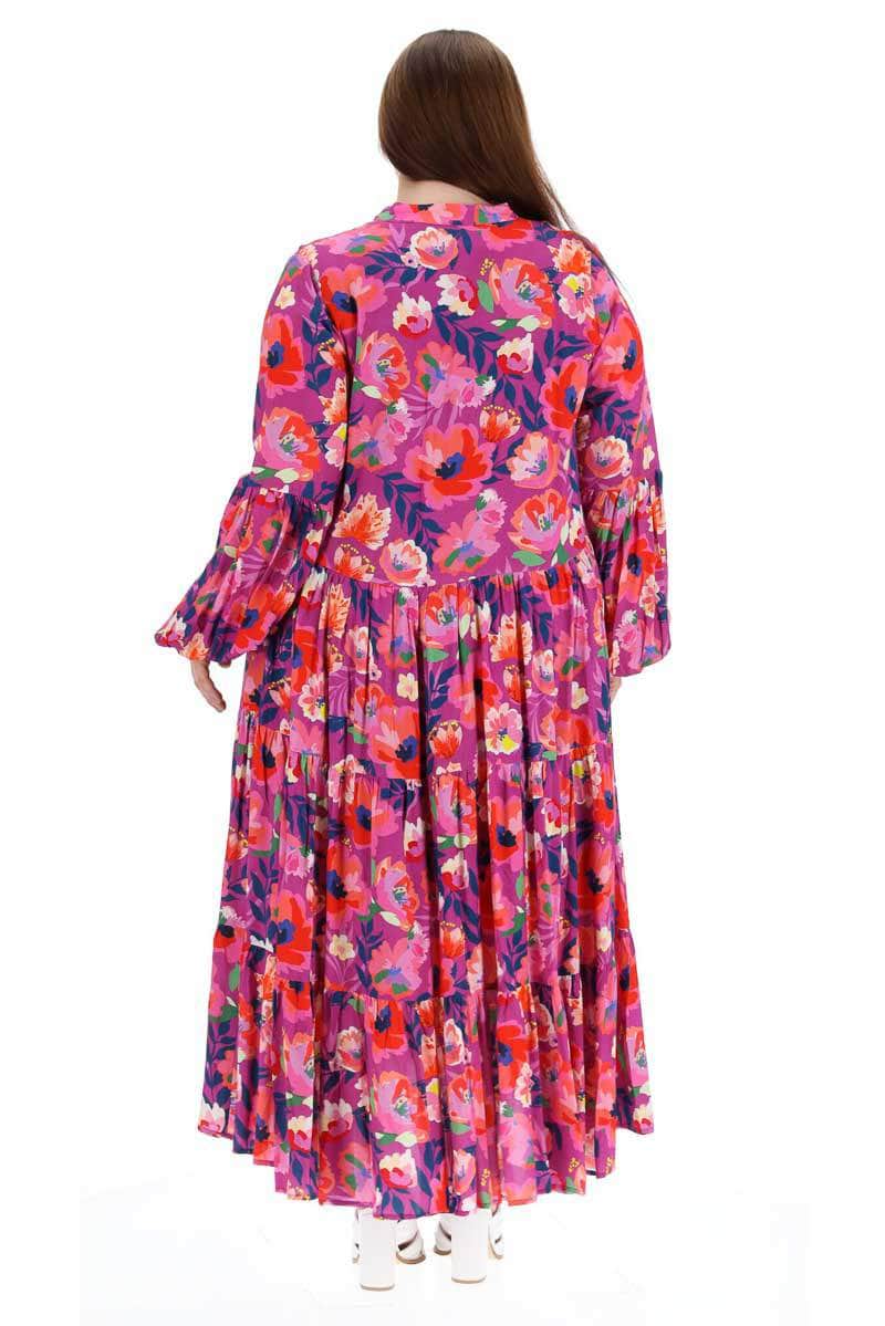 A mauve pink floral print tiered maxi shirt dress.