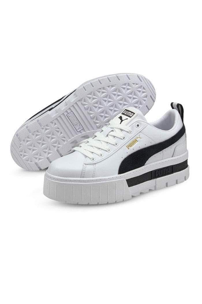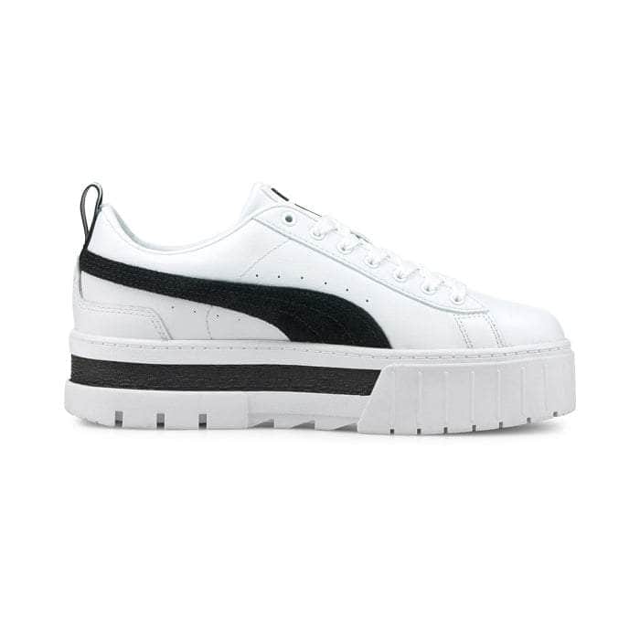 Puma's Mayze 'White/Black' sneakers are crafted from white leather with the signature Formstrip in contrasting black – the motif was originally designed to provide lateral support. A platform sole underfoot provides enhanced cushioning and edgy appeal.