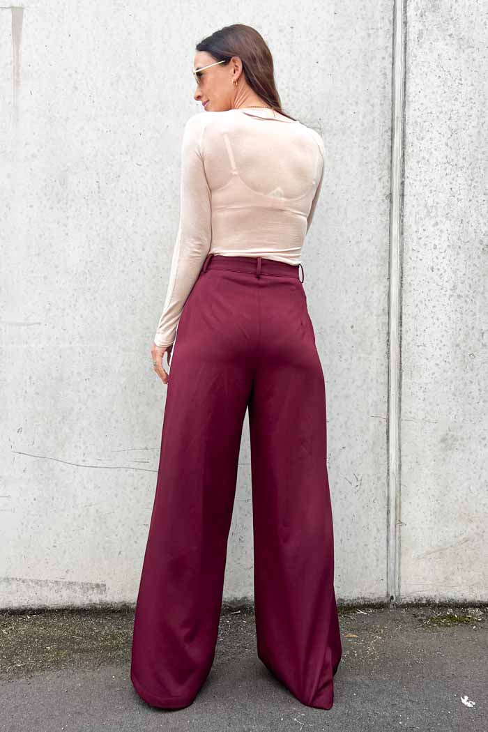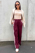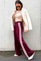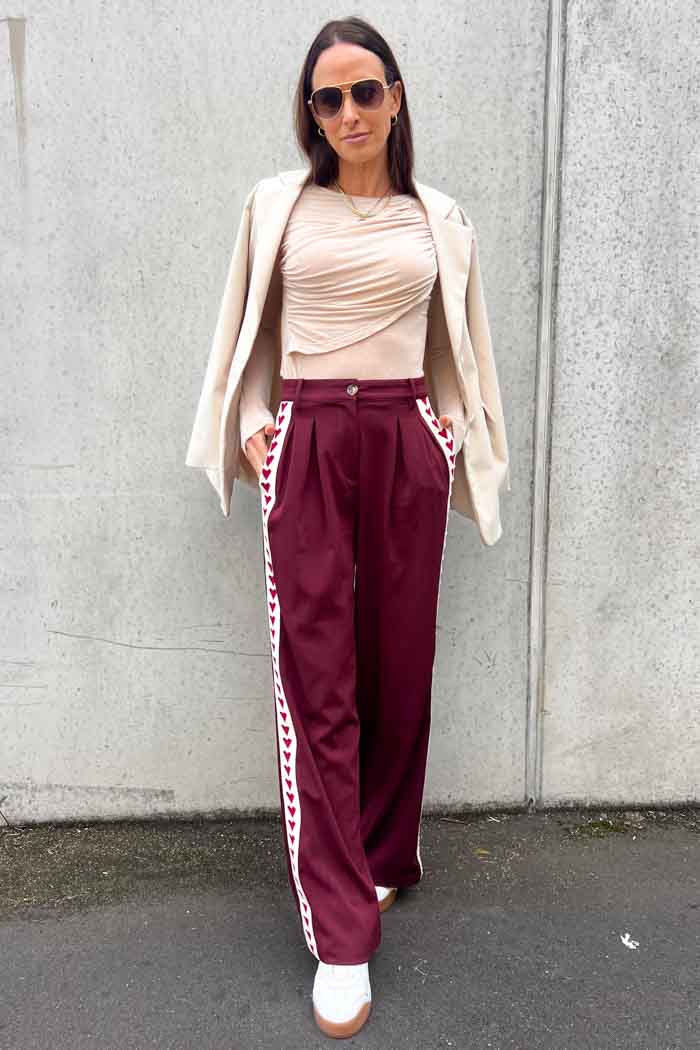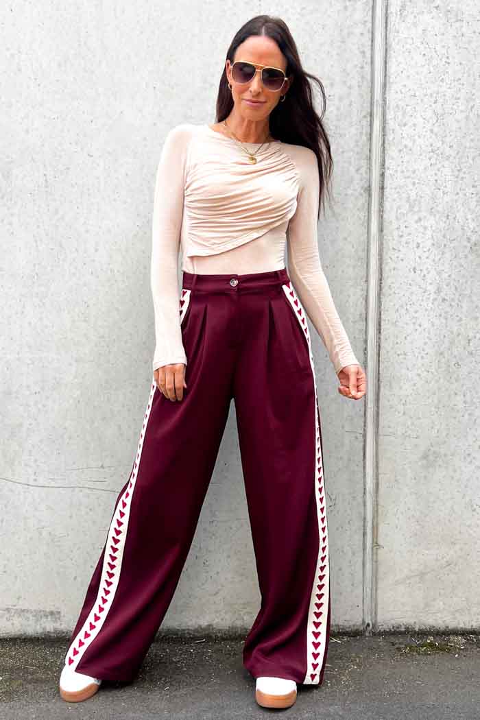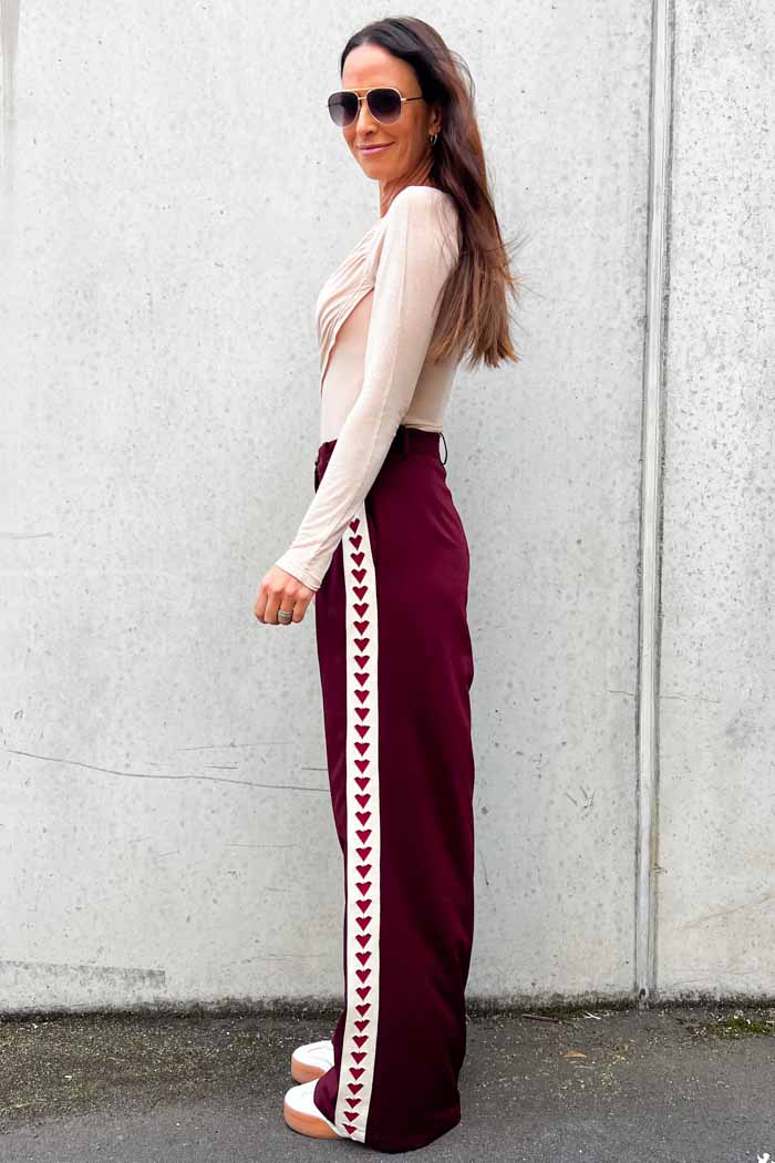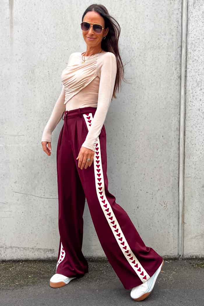 A burgundy wide leg pant with cream side stripe and heart detail.