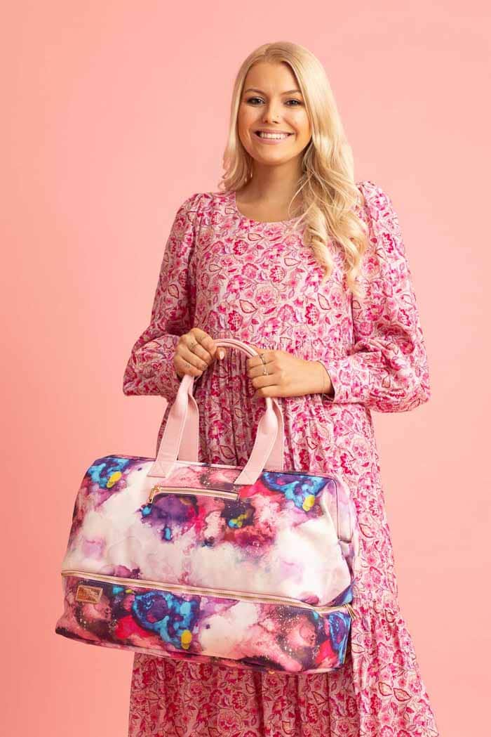 A pink & blue watercolour print overnight bag with zip up shoe compartment at the base. The interior has a padded sleeve for tablets or laptops, and small pockets for your valuables.