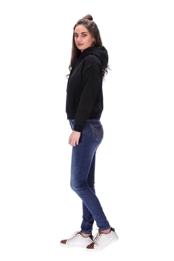 Features: Casual hoodie in medium length with silver eyelets, a grosgrain hoodie drawstring, ribbing on sleeves & hem.