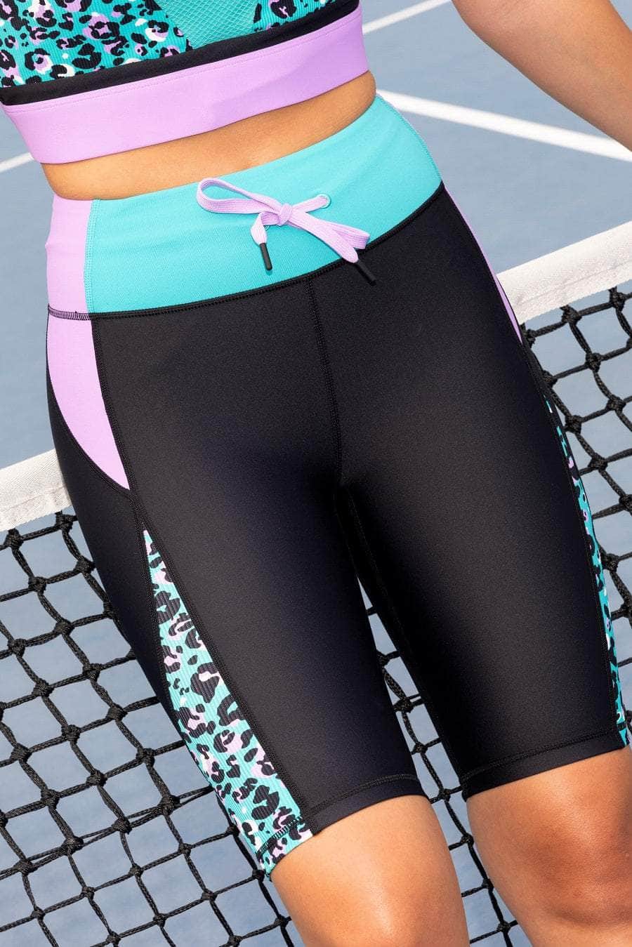 A black biker short with panels of teal and lilac.
