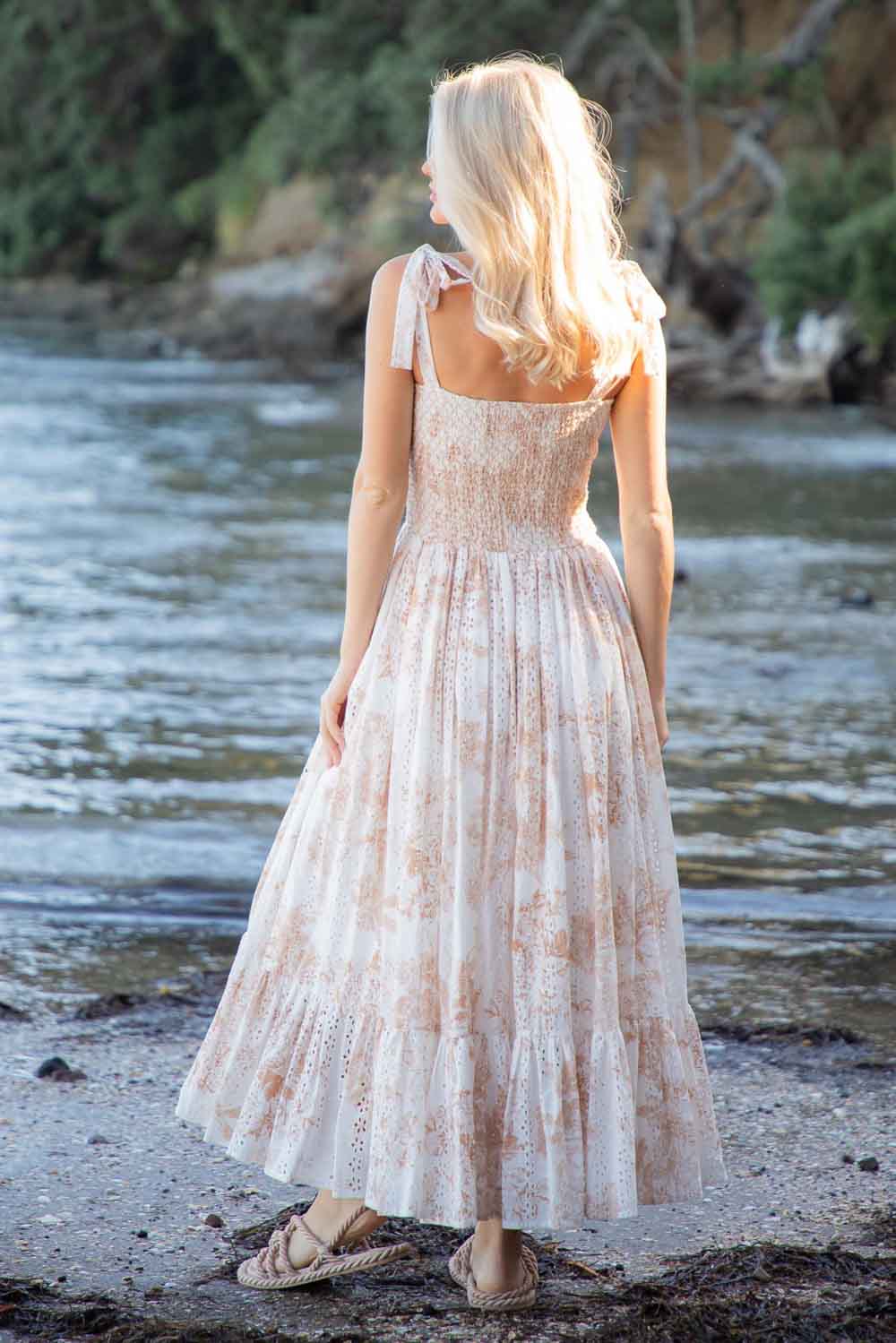 A white & beige floral print maxi dress with a smocked bodice.