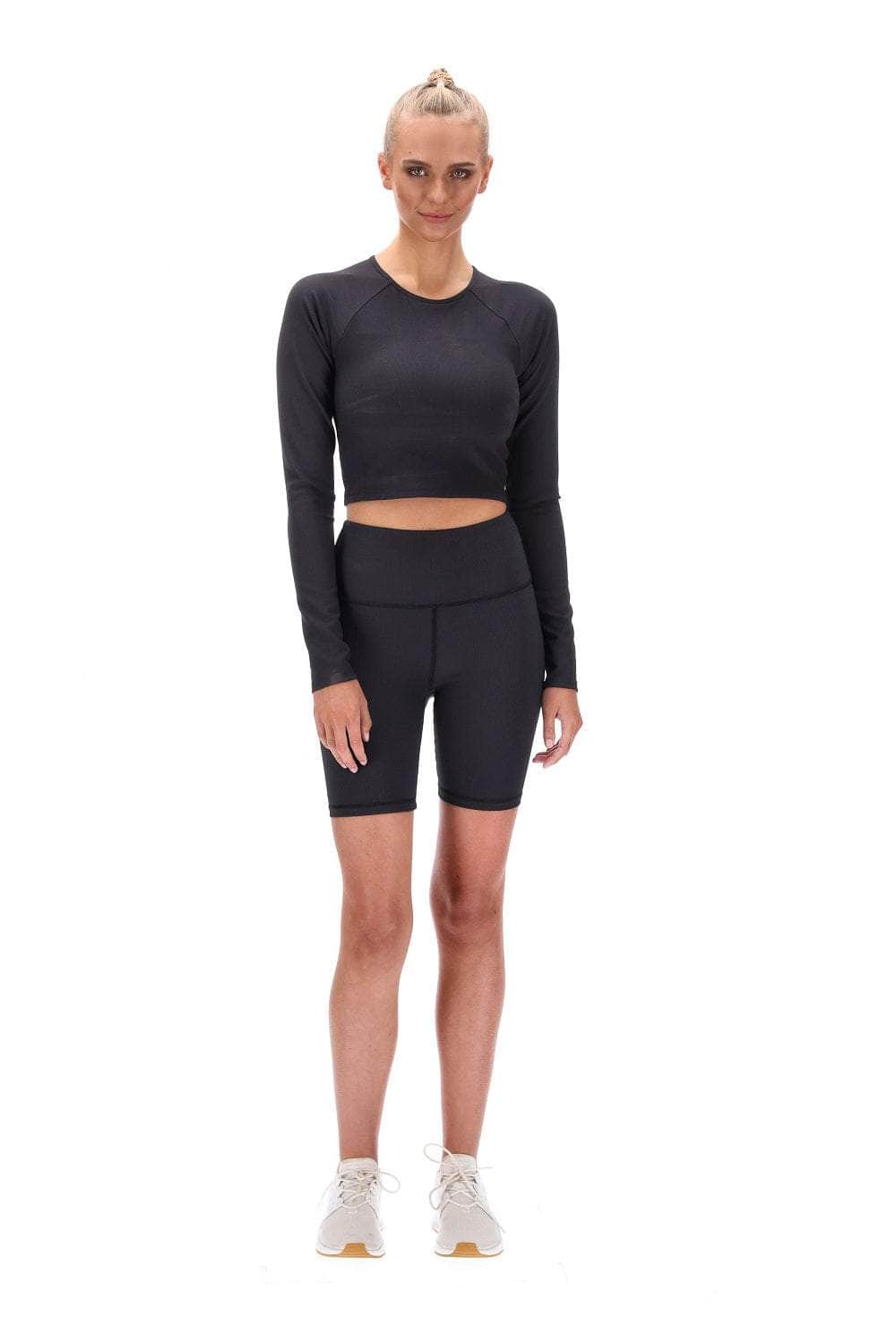 A black ribbed long-sleeve crop top with an in-built padded shelf bra, and thumb holes