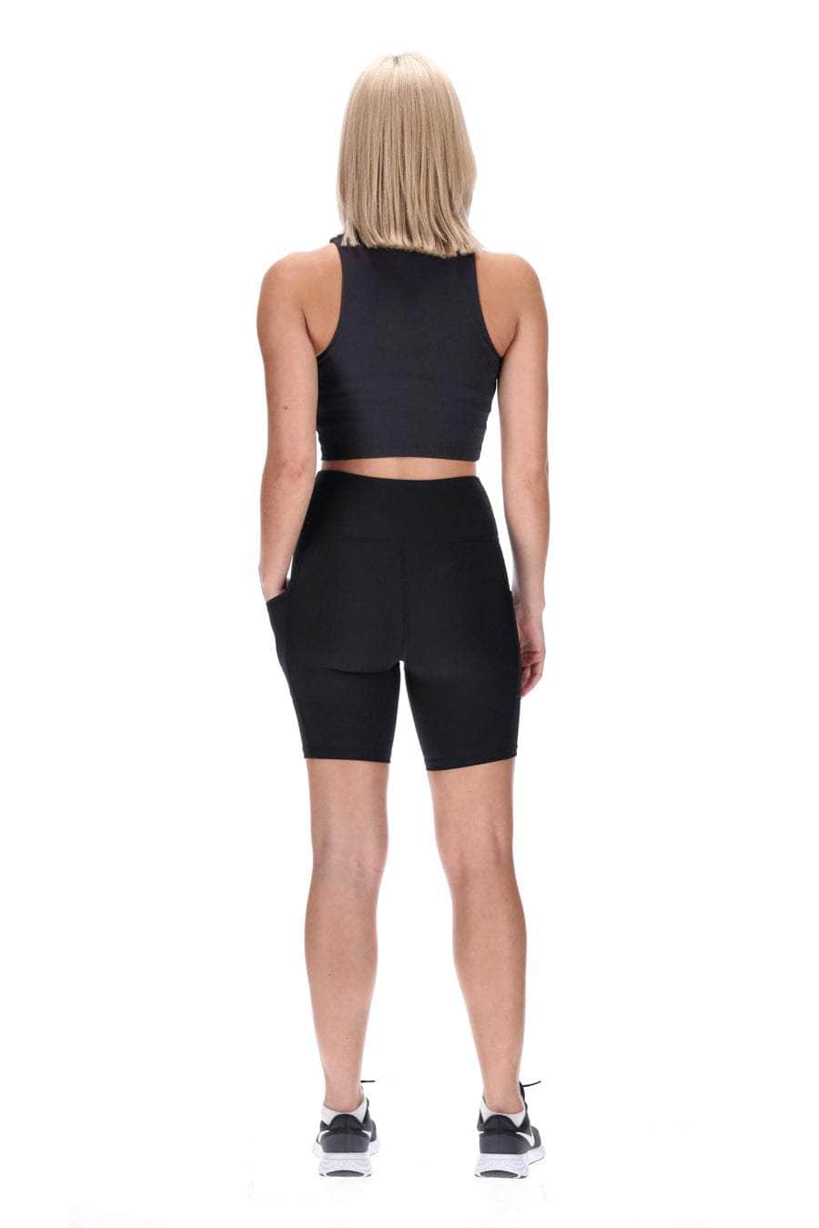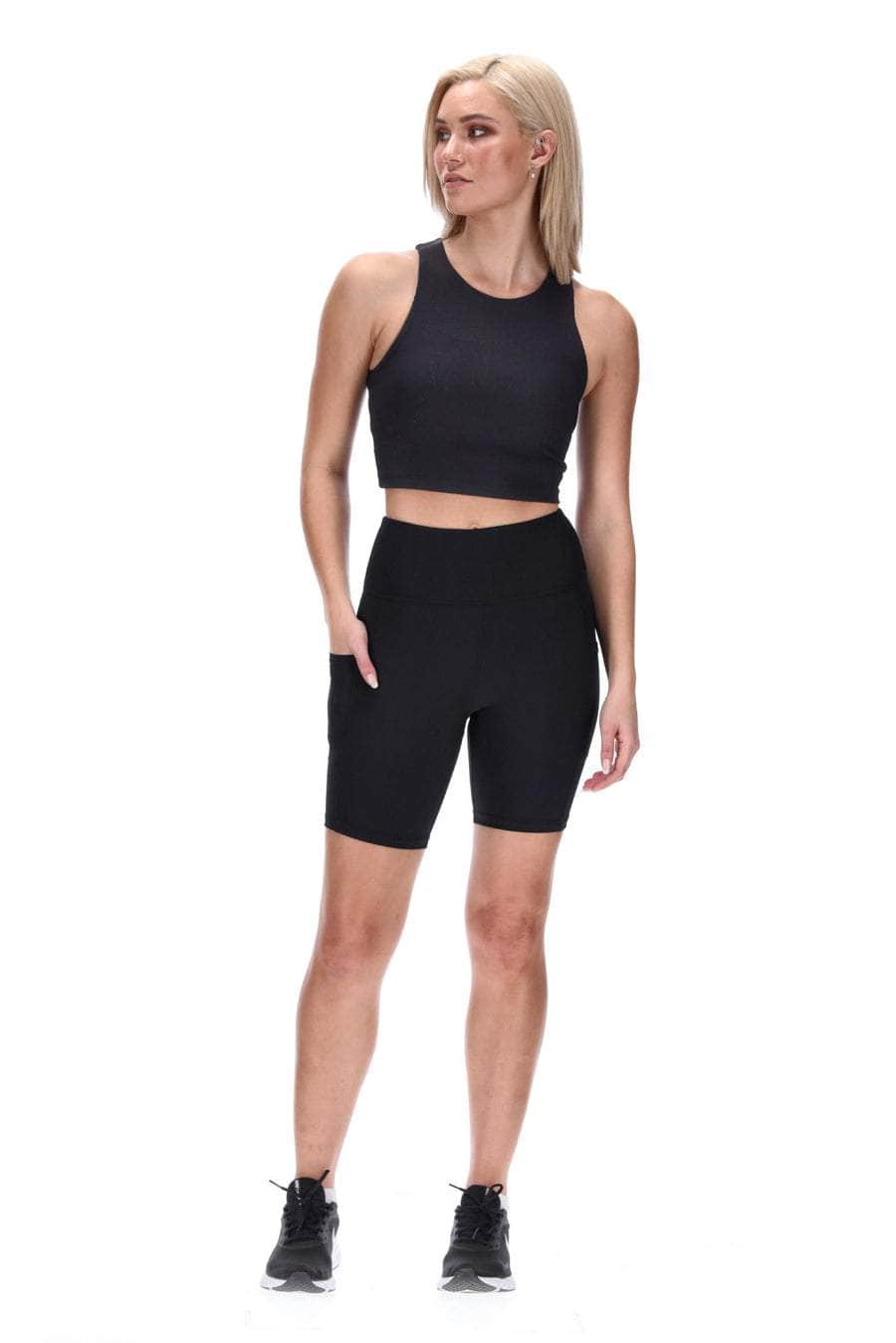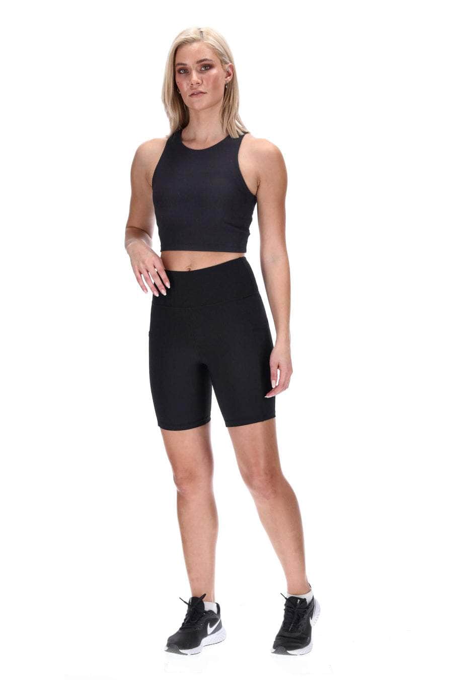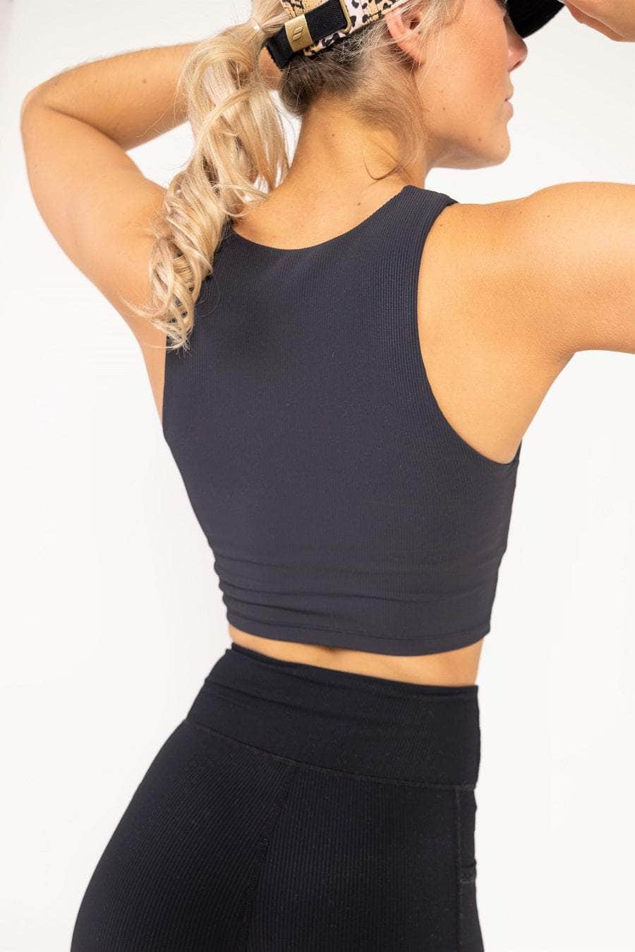 A black rib high neck top with a built-in elasticated bra with removable cups. A great top with full bust coverage.