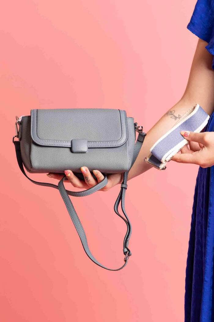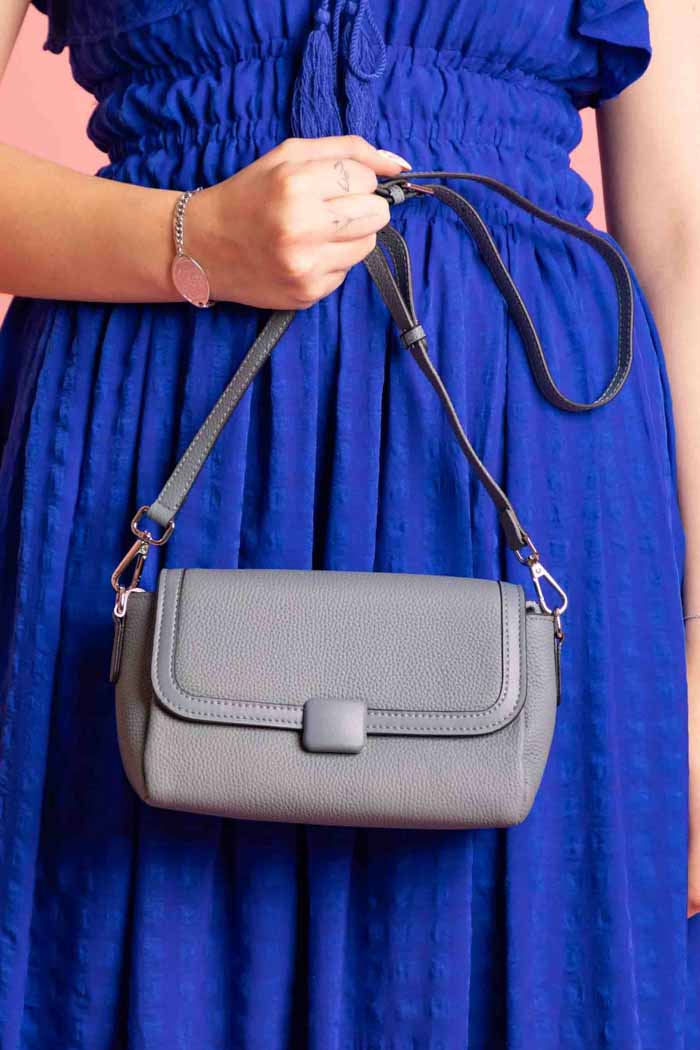 A grey blue rectangular handbag, with a long shoulder strap.