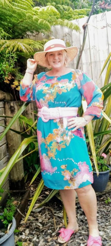 |A gorgeous turquoise abstract print mini dress, with off shoulder shirring, long sleeves and a tied waist