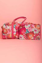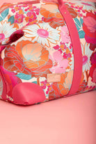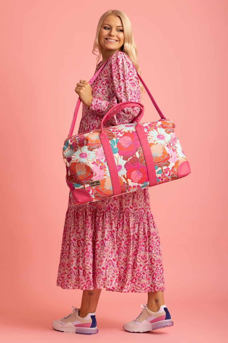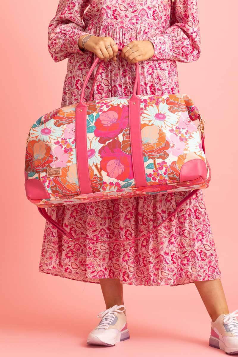 The perfect overnight bag! A pink floral print duffle bag, with pink handles and shoulder strap.