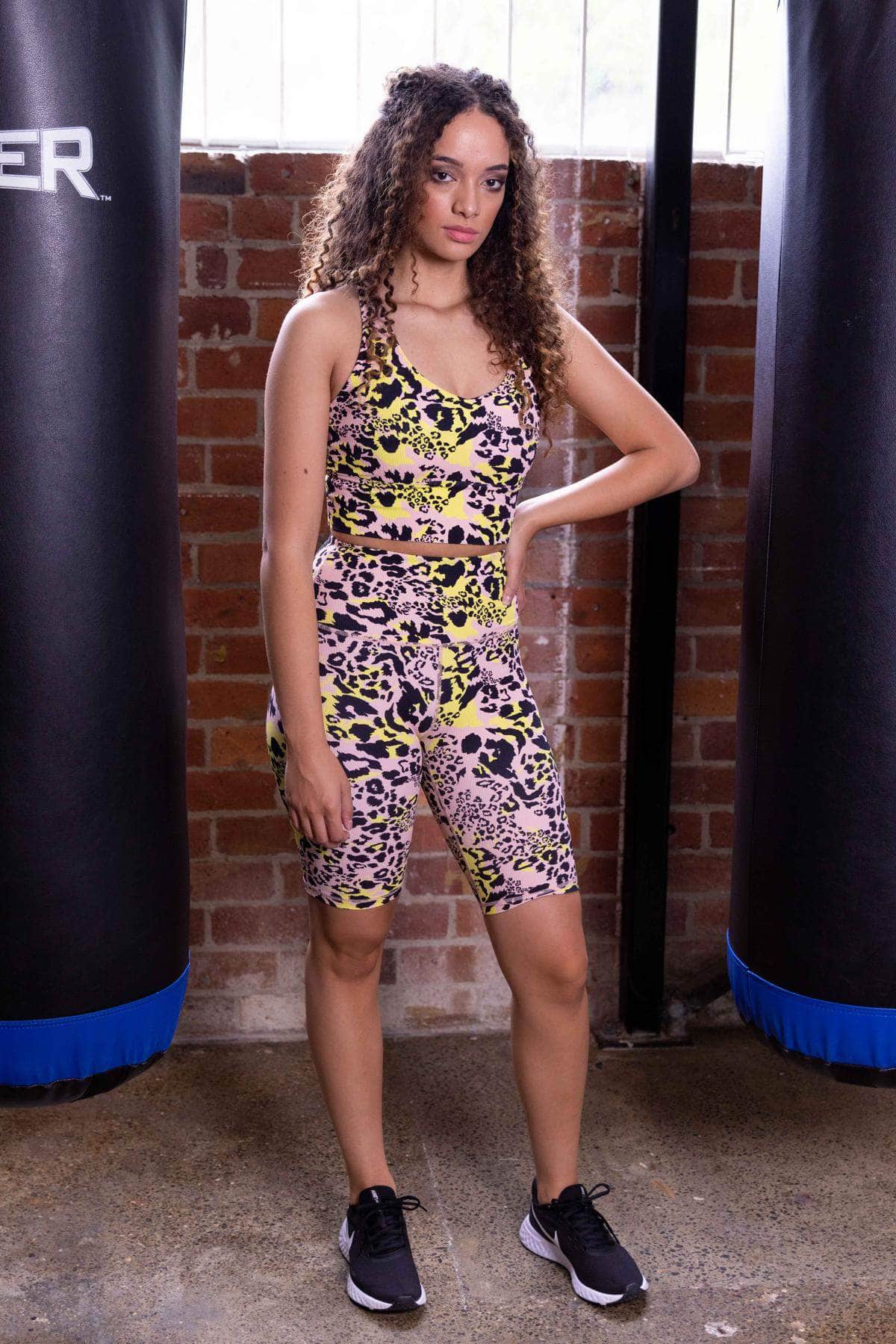 A highwaisted beige/fluro yellow leopard print rib biker short with a back waistband phone pocket