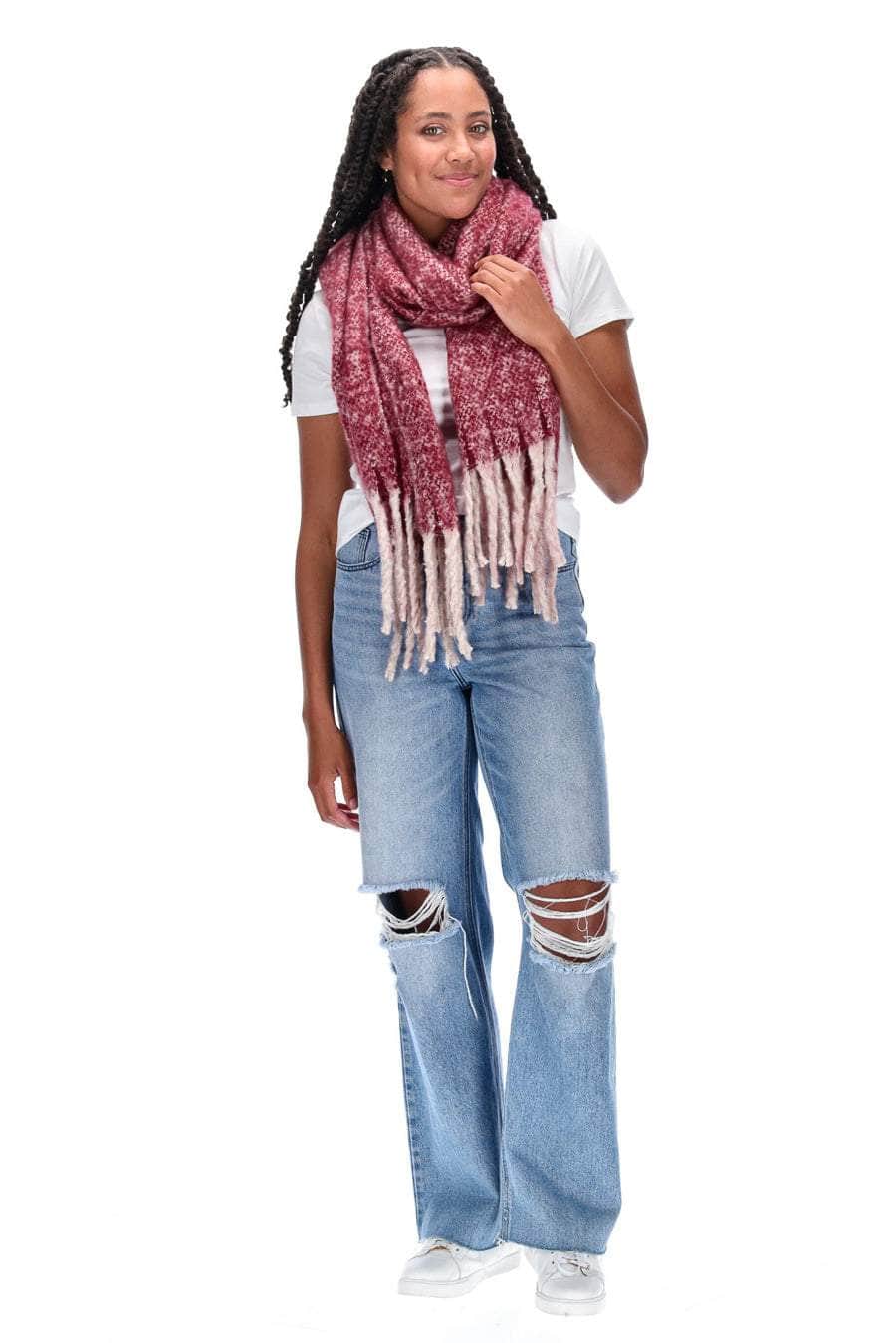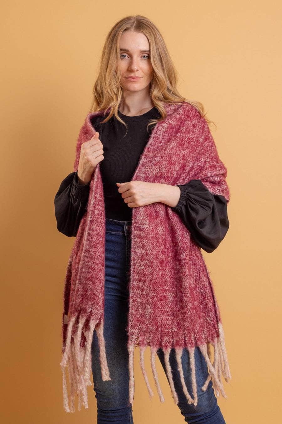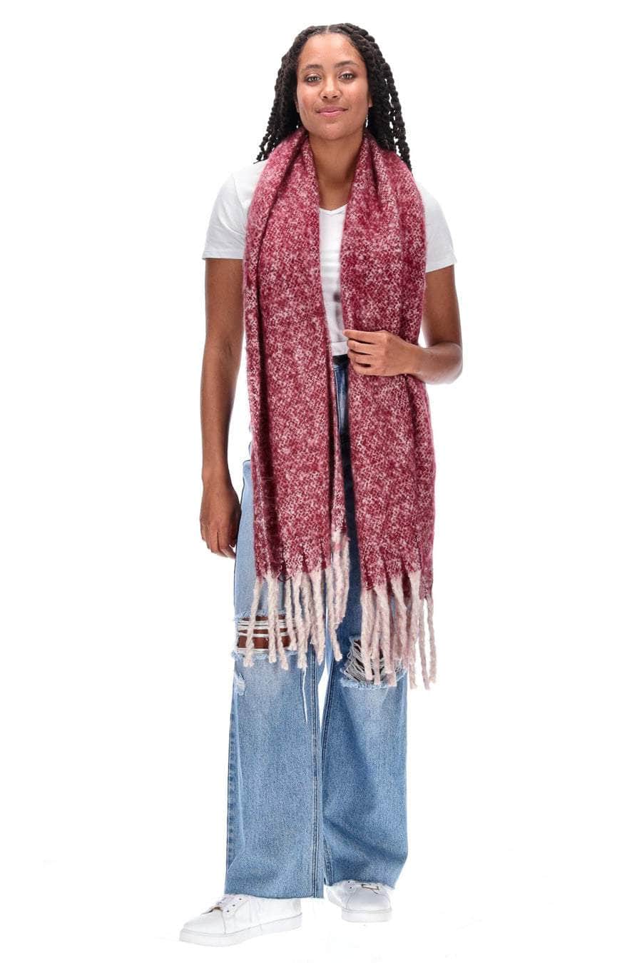 A cosy berry marle blanket scarf with tassel ends.