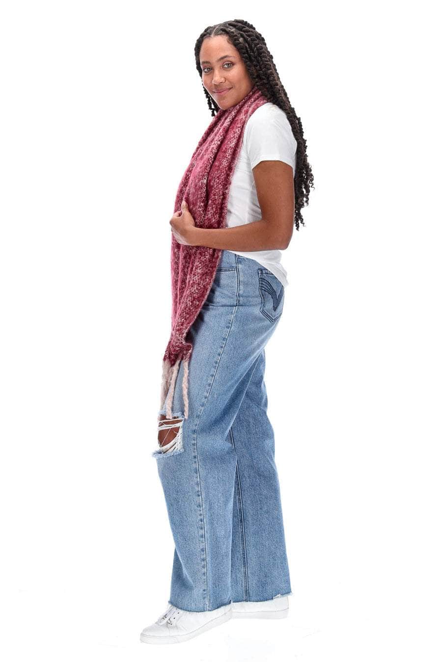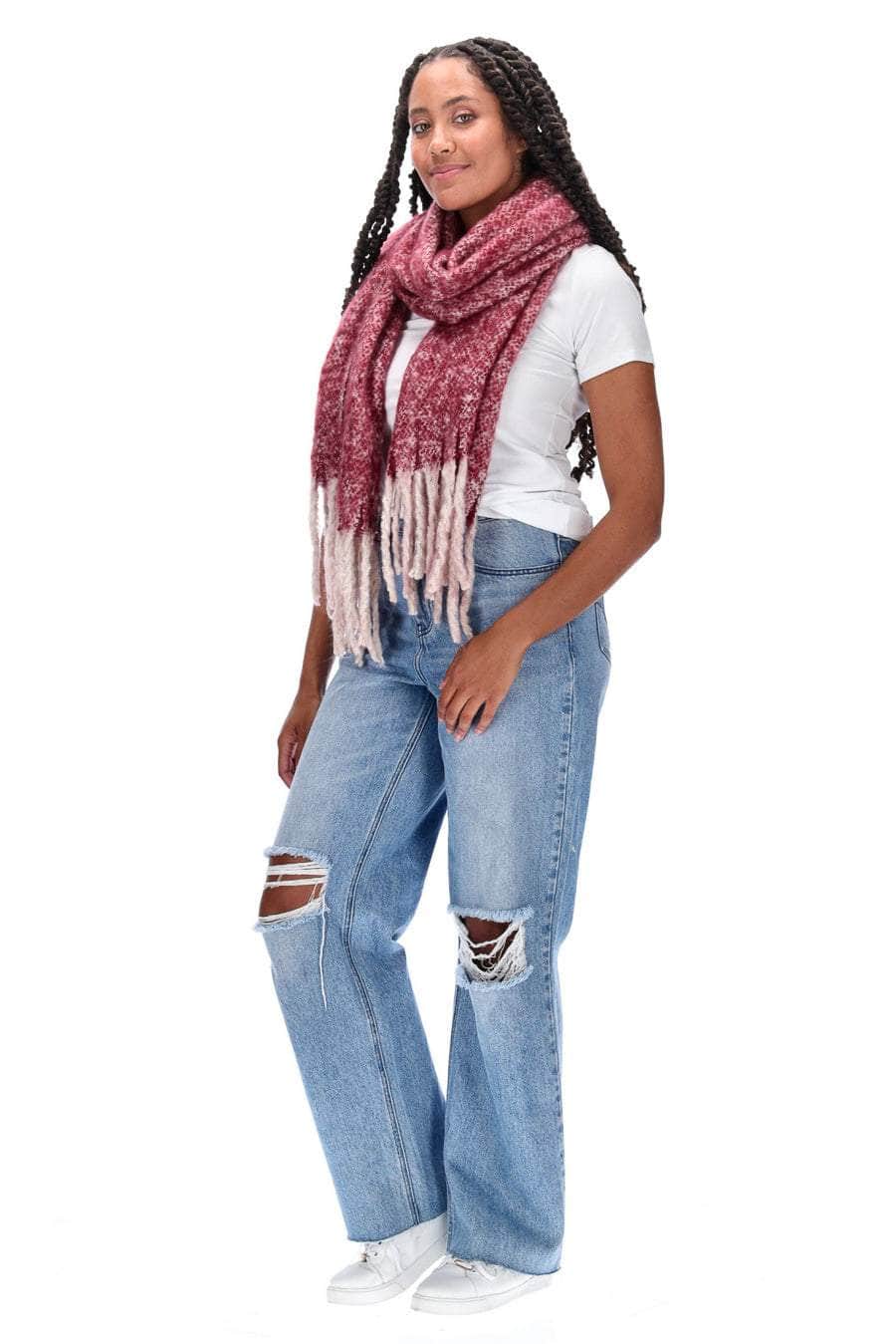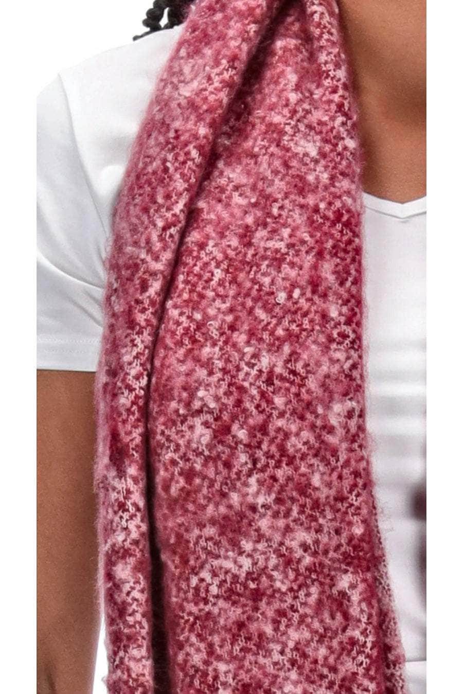 A cosy berry marle blanket scarf with tassel ends.
