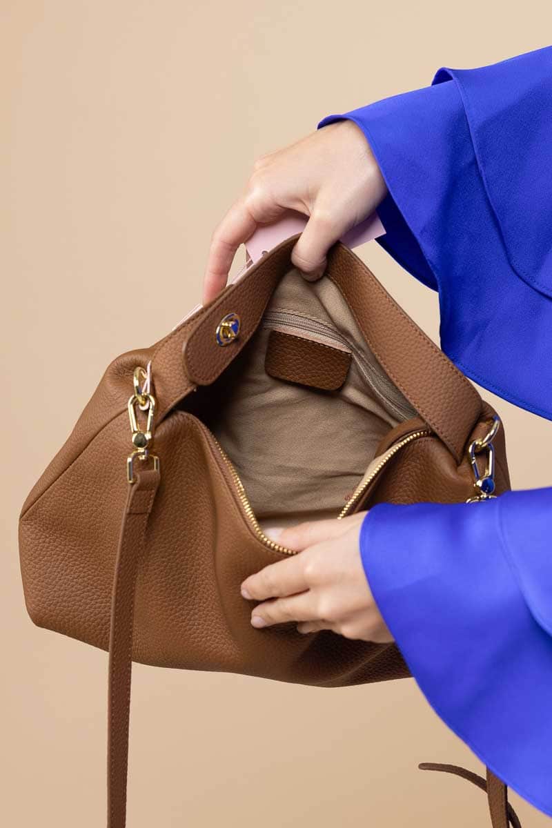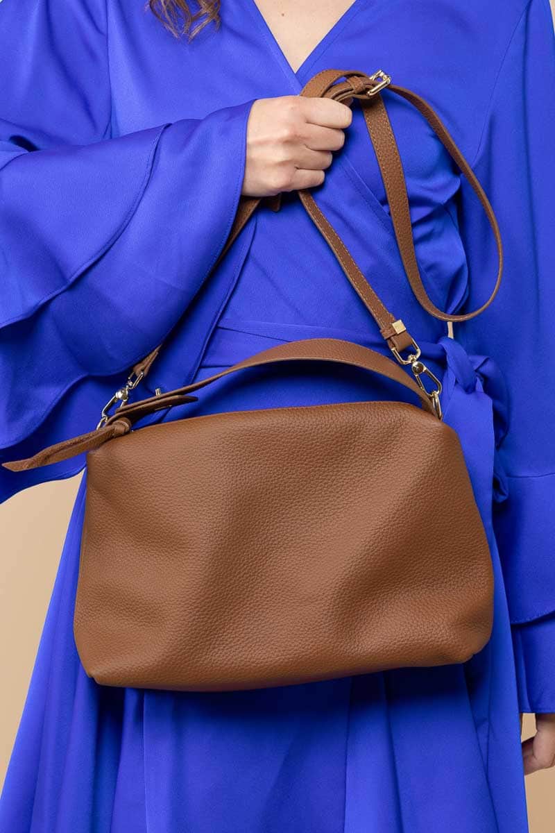 A brown leather handbag with a short handle, and a long shoulder strap.