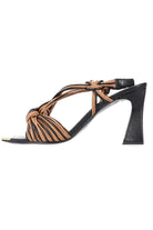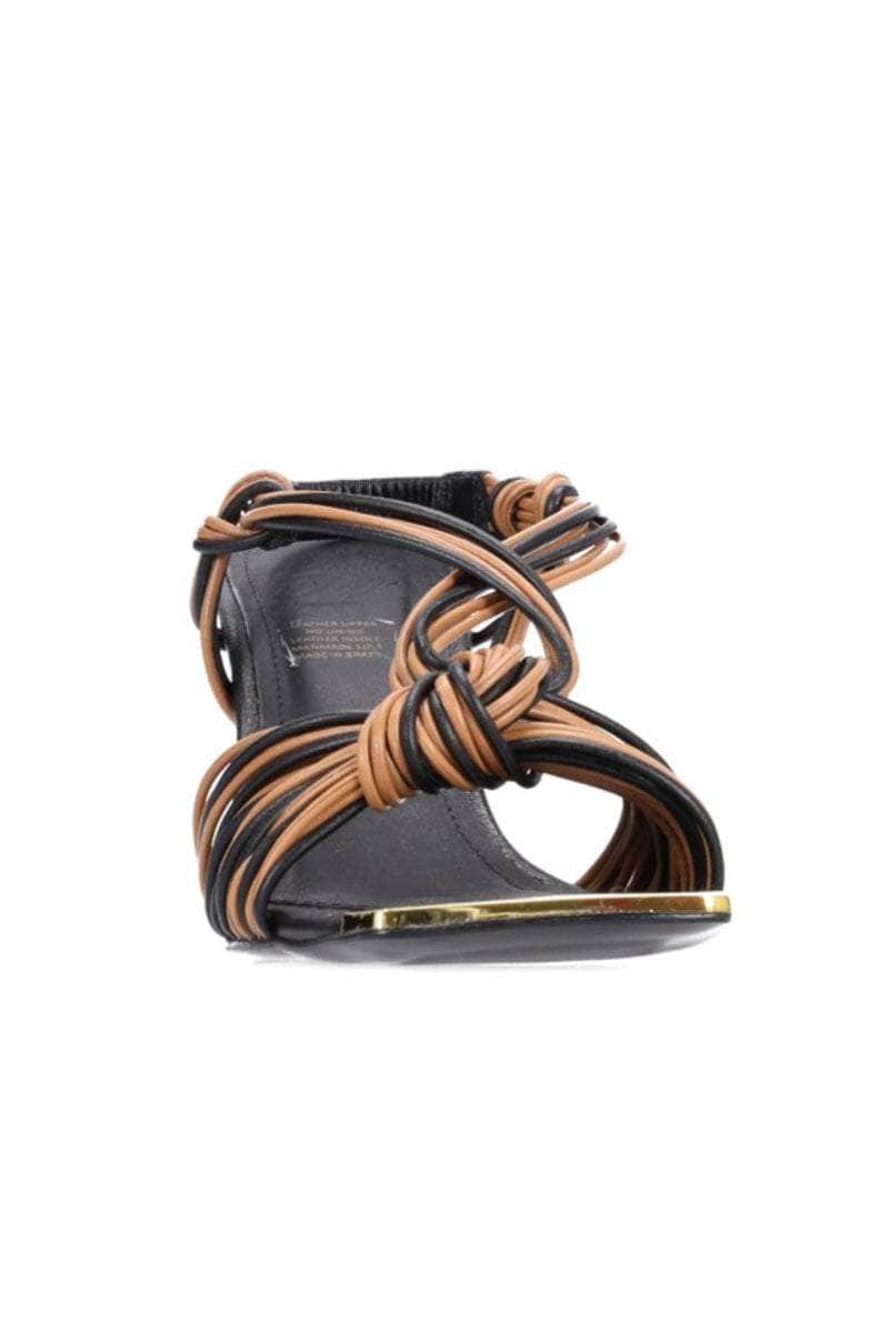 A brown & black knotted heel with gold square toe.