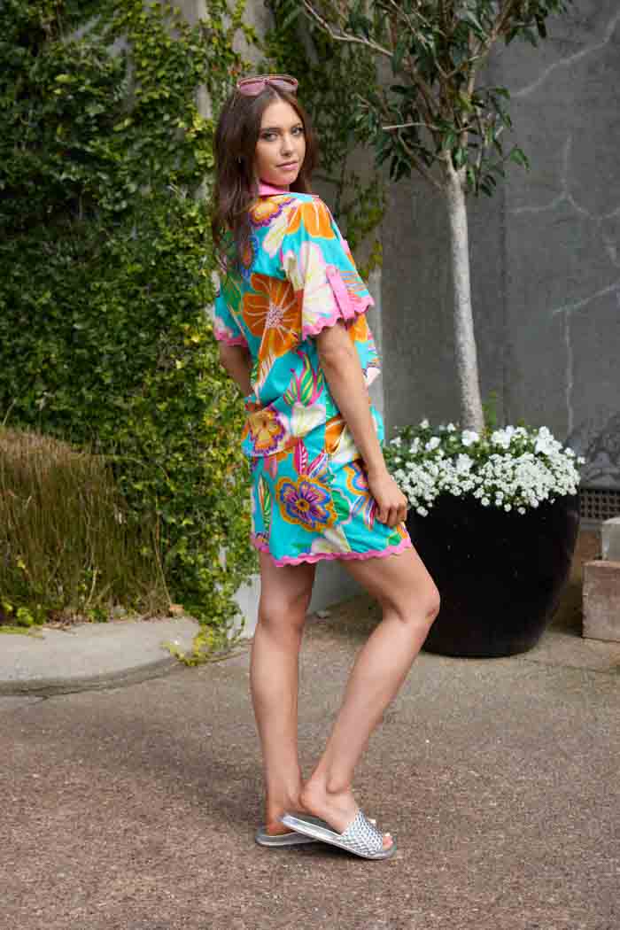 A vibrant teal floral short with pink waistband and ric rac.