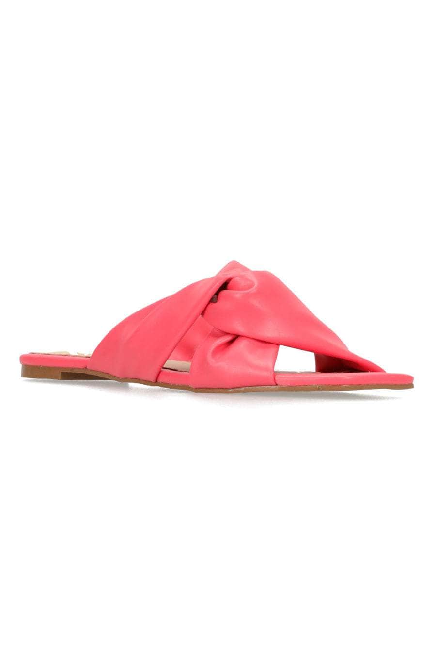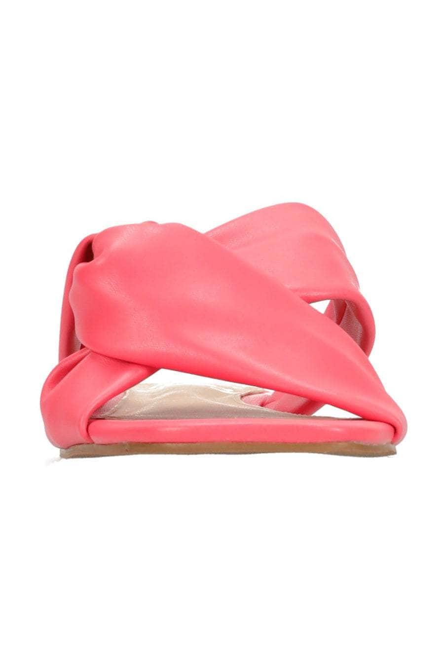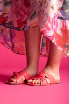 A coral pink leather twisted strap sandal.
