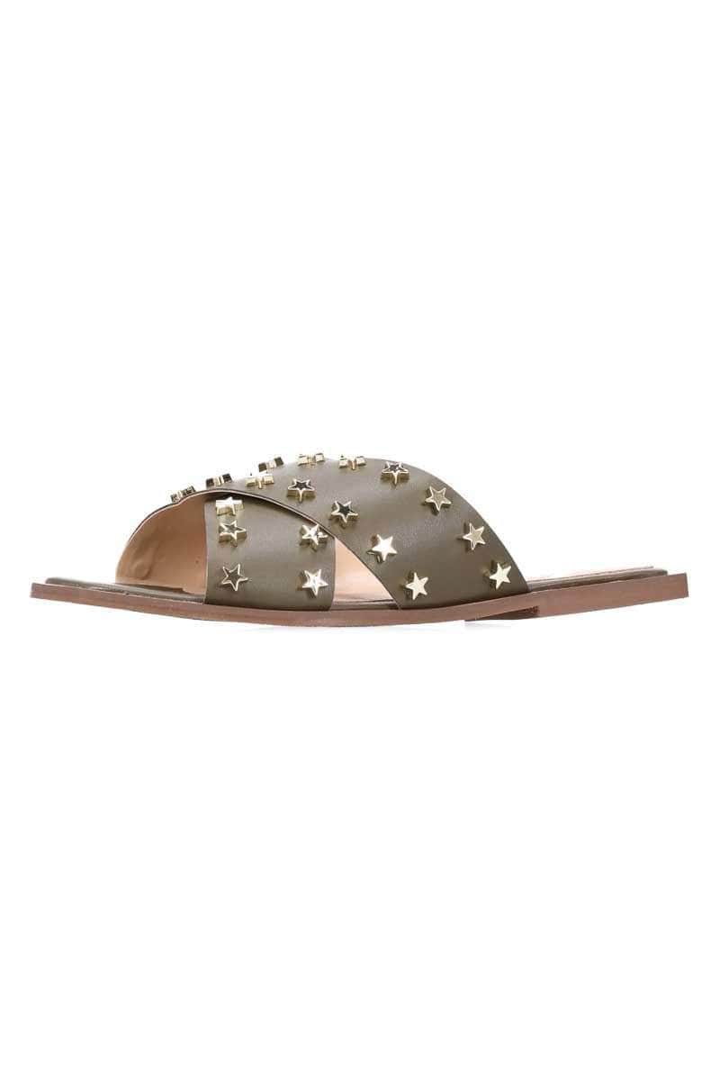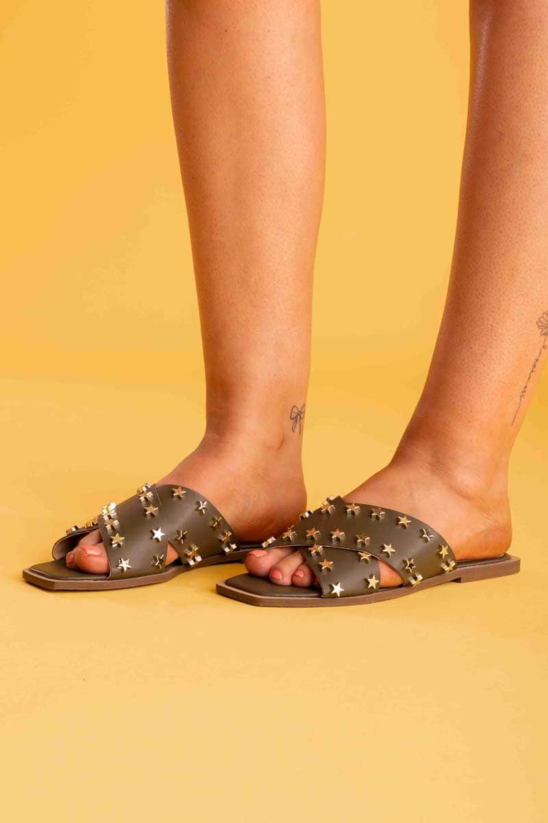 A khaki crossover sandal with gold star studs.