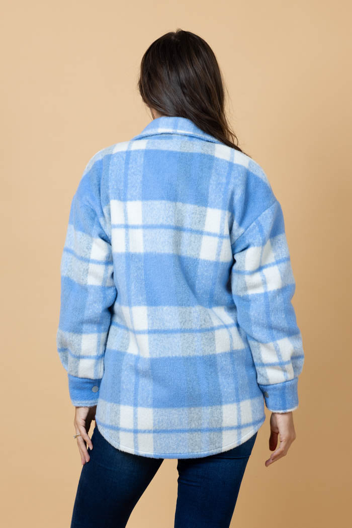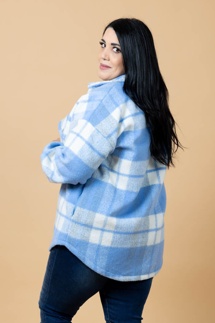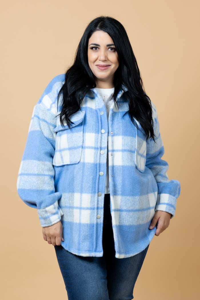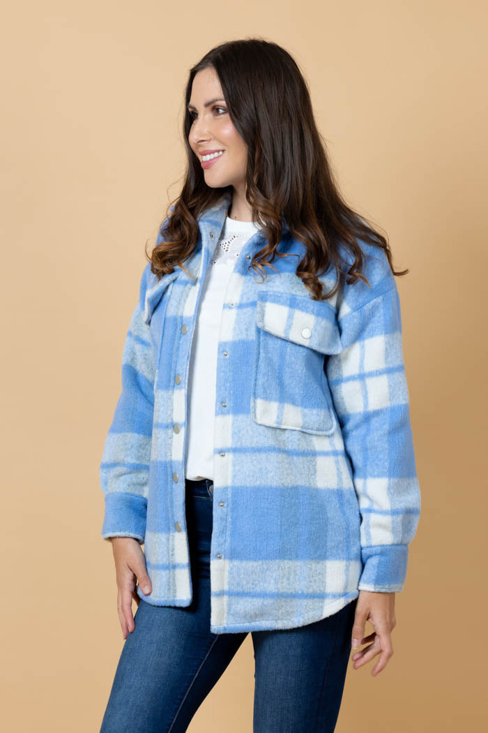 A blue & white tartan print shirt shacket.