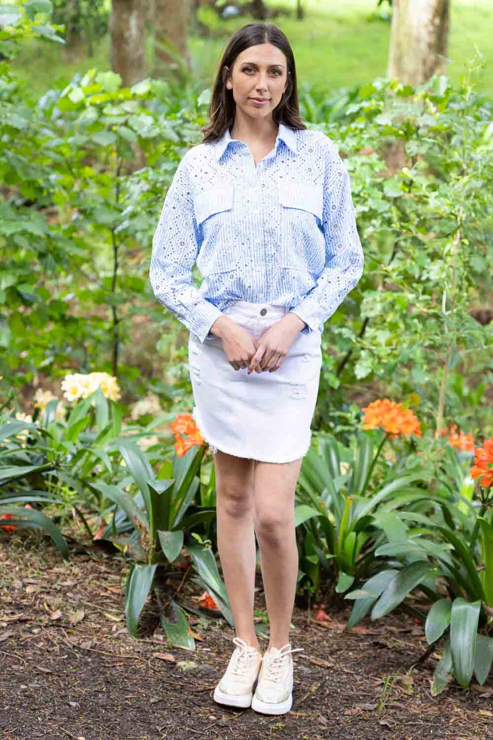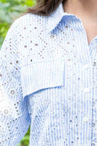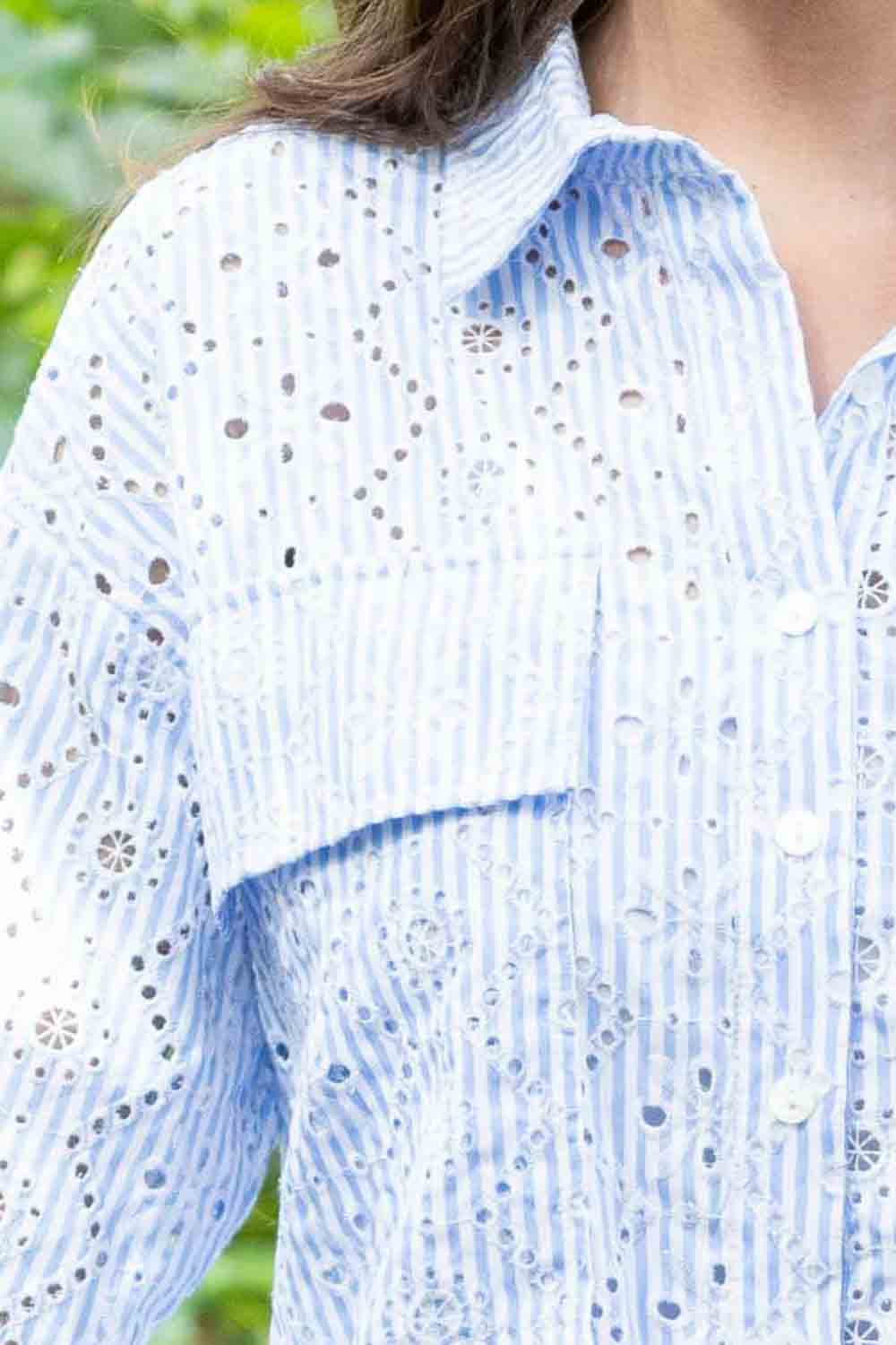 - Light blue & white stripe print with eyelet embroidery