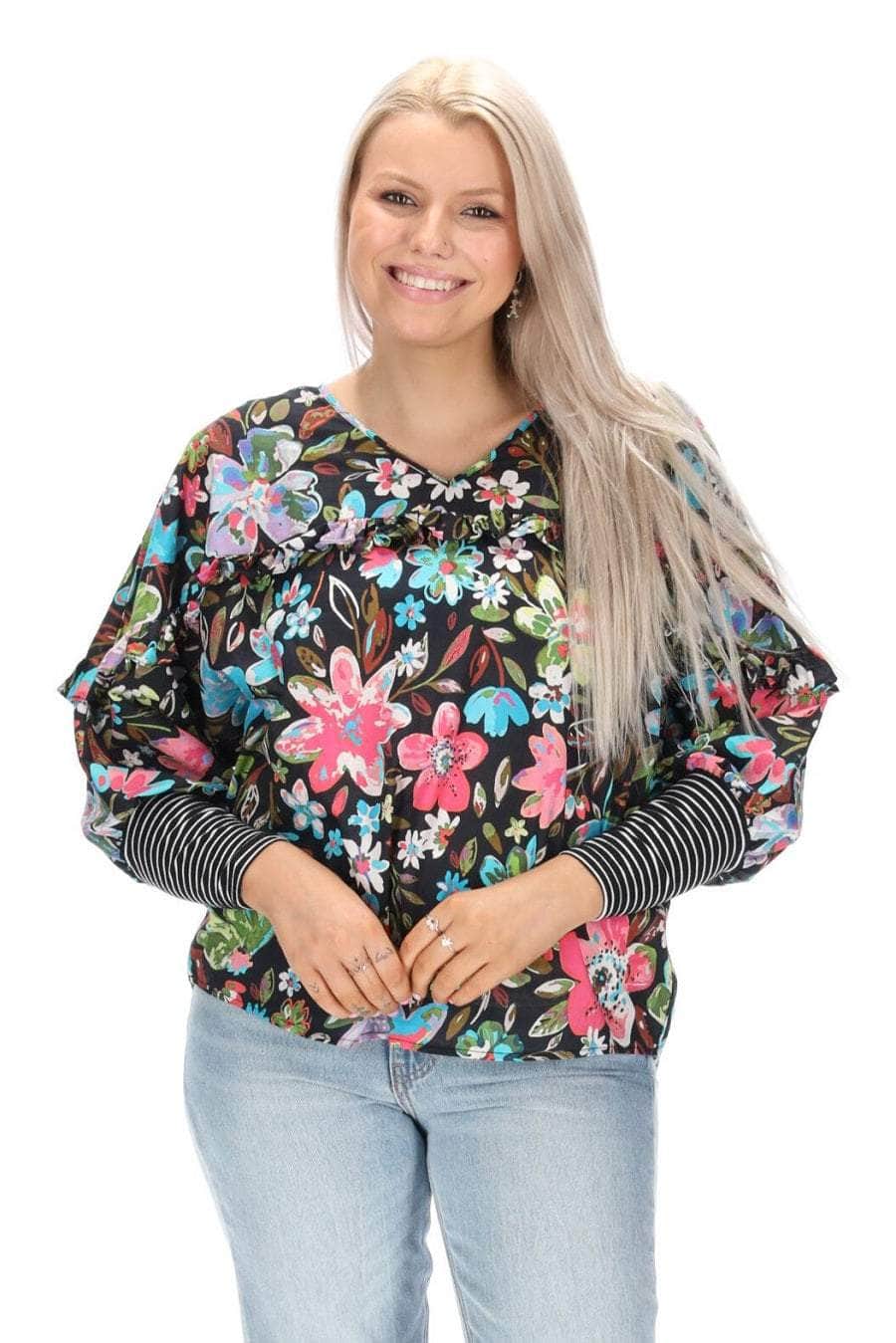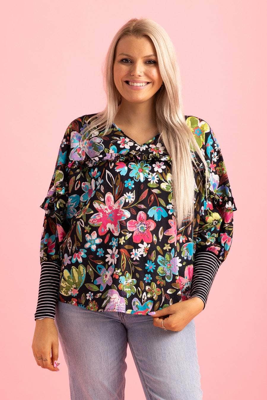 A frilly black floral print V neck top with ribbed cuffs.