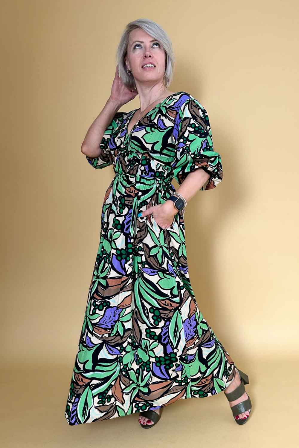 A V neck green abstract print maxi dress.