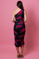 A black and pink floral one shoulder mesh fitted dress.