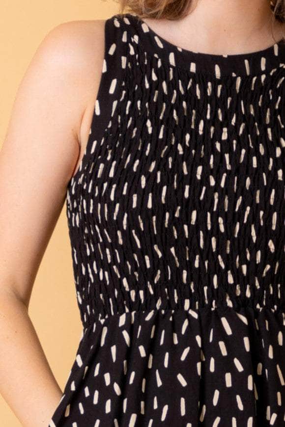 A black speck print shirred midi dress.